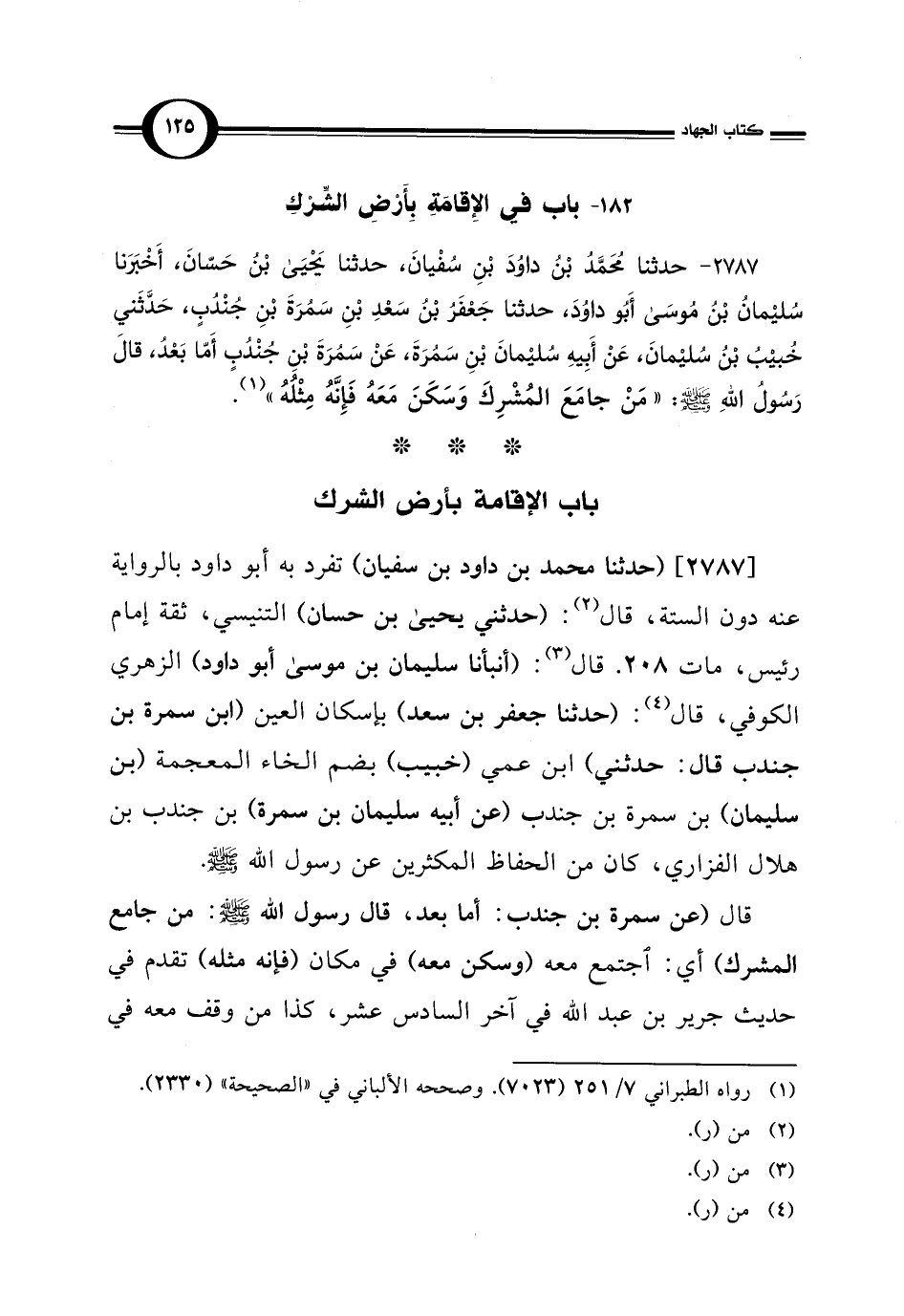 [2787] (حدثنا محمَّد بن داود بن سفيان) تفرد به أبو داود بالرواية عنه دون الستة، قال (¬2): (حدثني يحيى بن حسان) التنيسي، ثقة إمام رئيس، مات 208. قال (¬3): (أنبأنا سليمان بن موسى أبو داود) الزهري الكوفي، قال (¬4): (حدثنا جعفر بن سعد) بإسكان العين (ابن سمرة بن جندب قال: حدثني) ابن عمي (خبيب) بضم الخاء المعجمة (بن سليمان) بن سمرة بن جندب (عن أبيه سليمان بن سمرة) بن جندب بن هلال الفزاري، كان من الحفاظ المكثرين عن رسول الله - صلى الله عليه وسلم -.