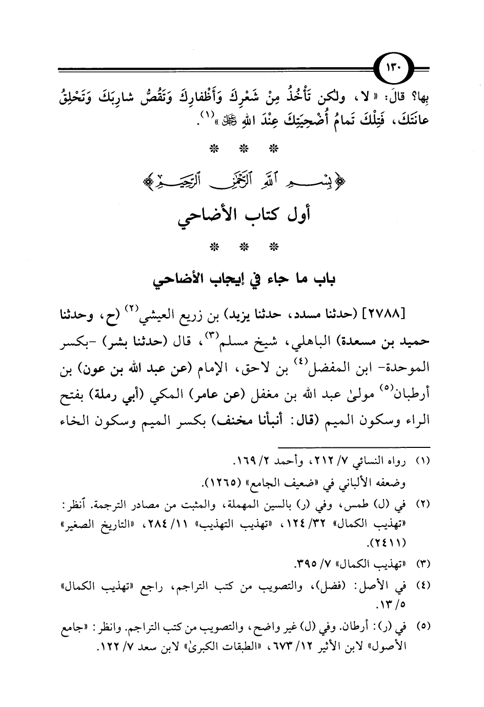 [2788] (حدثنا مسدد، حدثنا يزيد) بن زريع العيشي (¬2) (ح، وحدثنا حميد بن مسعدة) الباهلي، شيخ مسلم (¬3)، قال (حدثنا بشر) - بكسر الموحدة - ابن المفضل (¬4) بن لاحق، الإمام (عن عبد الله بن عون) بن أرطبان (¬5) مولى عبد الله بن مغفل (عن عامر) المكي (أبي رملة) بفتح الراء وسكون الميم (قال: أنبأنا مخنف) بكسر الميم وسكون الخاء