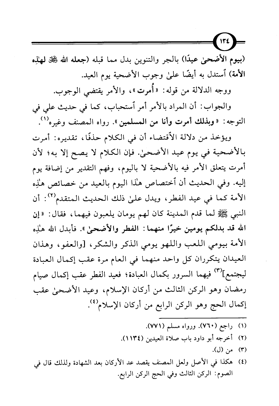 ويؤخذ من دلالة الاقتضاء أن في الكلام حذفًا، تقديره: أمرت بالأضحية في يوم عيد الأضحى. فإن الكلام لا يصح إلا به؛ لأنَّ أمرت يتعلق الأمر فيه بالأضحية لا باليوم، وفهم التقدير من إضافة يوم إليه. وفي الحديث أن اختصاص هذا اليوم بالعيد من خصائص هذِه الأمة كما في عيد الفطر، ويدل على ذلك الحديث المتقدم (¬2): أن النبي - صلى الله عليه وسلم - لما قدم المدينة كان لهم يومان يلعبون فيهما، فقال: "إن الله قد بدلكم يومين خيرًا منهما: الفطر والأضحى". فأبدل الله هذِه الأمة بيومي اللعب واللهو يومي الذكر والشكر، [والعفو، وهذان العيدان يتكرران كل واحد منهما في العام مرة عقب إكمال العبادة ليجتمع] (¬3) فيهما السرور بكمال العبادة؛ فعيد الفطر عقب إكمال صيام رمضان وهو الركن الثالث من أركان الإِسلام، وعيد الأضحى عقب إكمال الحج وهو الركن الرابع من أركان الإِسلام (¬4).