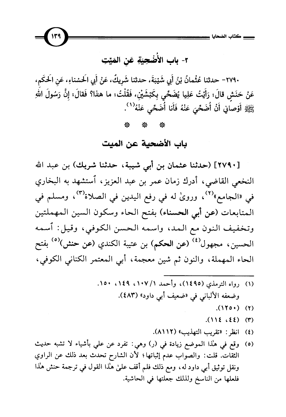 2790 - حدثنا عُثْمانُ بْنُ أَبي شَيْبَةَ، حدثنا شَرِيكٌ، عَنْ أَبي الحَسْناءِ، عَنِ الحَكَمِ، عَنْ حَنَشٍ قَالَ: رَأَيْتُ عَلِيا يُضَحِّي بِكَبْشَيْنِ، فَقُلْتُ: ما هذا؟ فَقالَ: إِنَّ رَسُولَ اللهِ - صلى الله عليه وسلم - أَوْصاني أَنْ أُضَحِّيَ عَنْهُ فَأَنا أُضَحِّي عَنْهُ (¬1).
