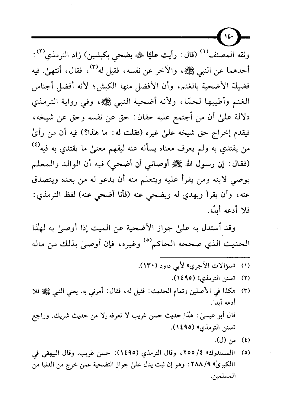 (¬5) "المستدرك" 4/ 255، وقال الترمذي (1495): حسن غريب. وقال البيهقي في "الكبرى" 9/ 288: وهو إن ثبت يدلّ على جواز التضحية عمن خرج من الدنيا من المسلمين.