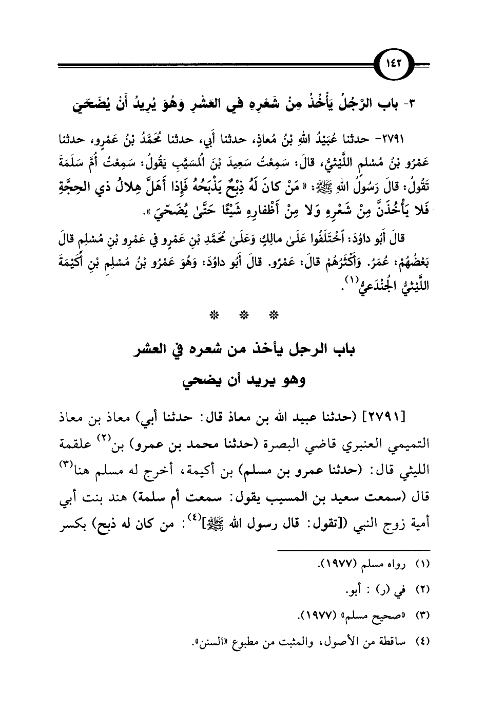 [2791] (حدثنا عبيد الله بن معاذ قال: حدثنا أبي) معاذ بن معاذ التميمي العنبري قاضي البصرة (حدثنا محمَّد بن عمرو) بن (¬2) علقمة الليثي قال: (حدثنا عمرو بن مسلم) بن أكيمة، أخرج له مسلم هنا (¬3) قال (سمعت سعيد بن المسيّب يقول: سمعت أم سلمة) هند بنت أبي أمية زوج النبي ([تقول: قال رسول الله - صلى الله عليه وسلم -] (¬4): من كان له ذبح) بكسر