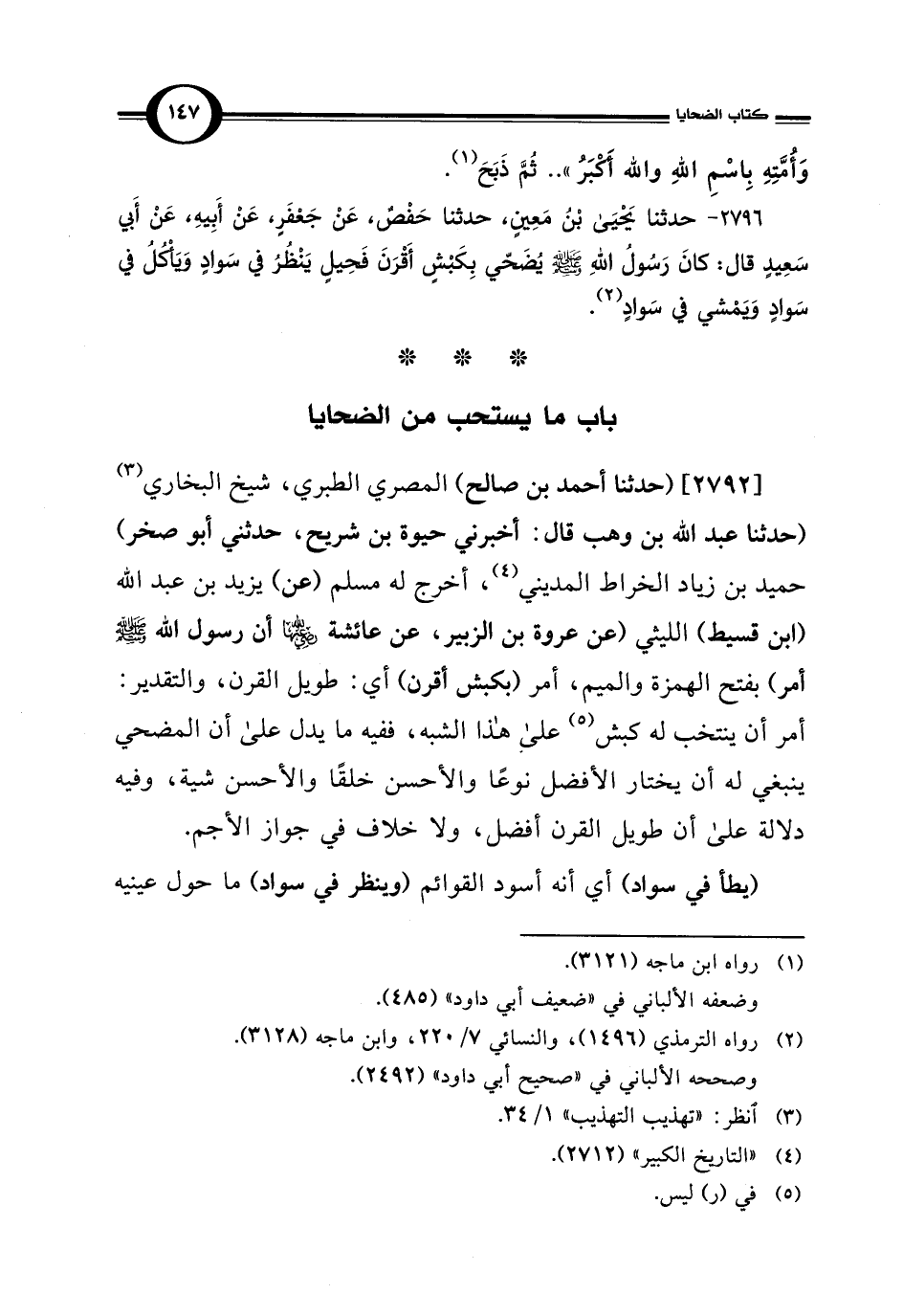 2796 - حدثنا يَحْيَى بْنُ مَعِينٍ، حدثنا حَفْصٌ، عَنْ جَعْفَرٍ، عَنْ أَبِيهِ، عَنْ أَبي سَعِيدٍ قال: كانَ رَسُولُ اللهِ - صلى الله عليه وسلم - يُضَحّي بِكَبْشٍ أَقْرَنَ فَحِيلٍ يَنْظُرُ في سَوادٍ وَيَأْكُلُ في سَوادٍ وَيَمْشي في سَوادٍ (¬2).