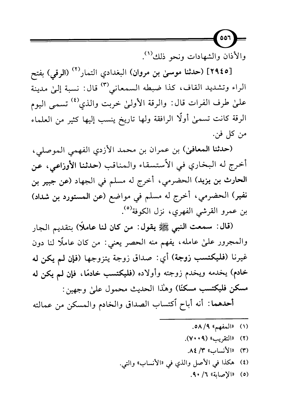 [2945] (حدثنا موسى بن مروان) البغدادي التمار (¬2) (الرقي) بفتح الراء وتشديد القاف، كذا ضبطه السمعاني (¬3) قال: نسبة إلى مدينة على طرف الفرات قال: والرقة الأولى خربت والذي (¬4) تسمى اليوم الرقة كانت تسمى أولًا الرافقة ولها تاريخ ينسب إليها كثير من العلماء من كل فن.