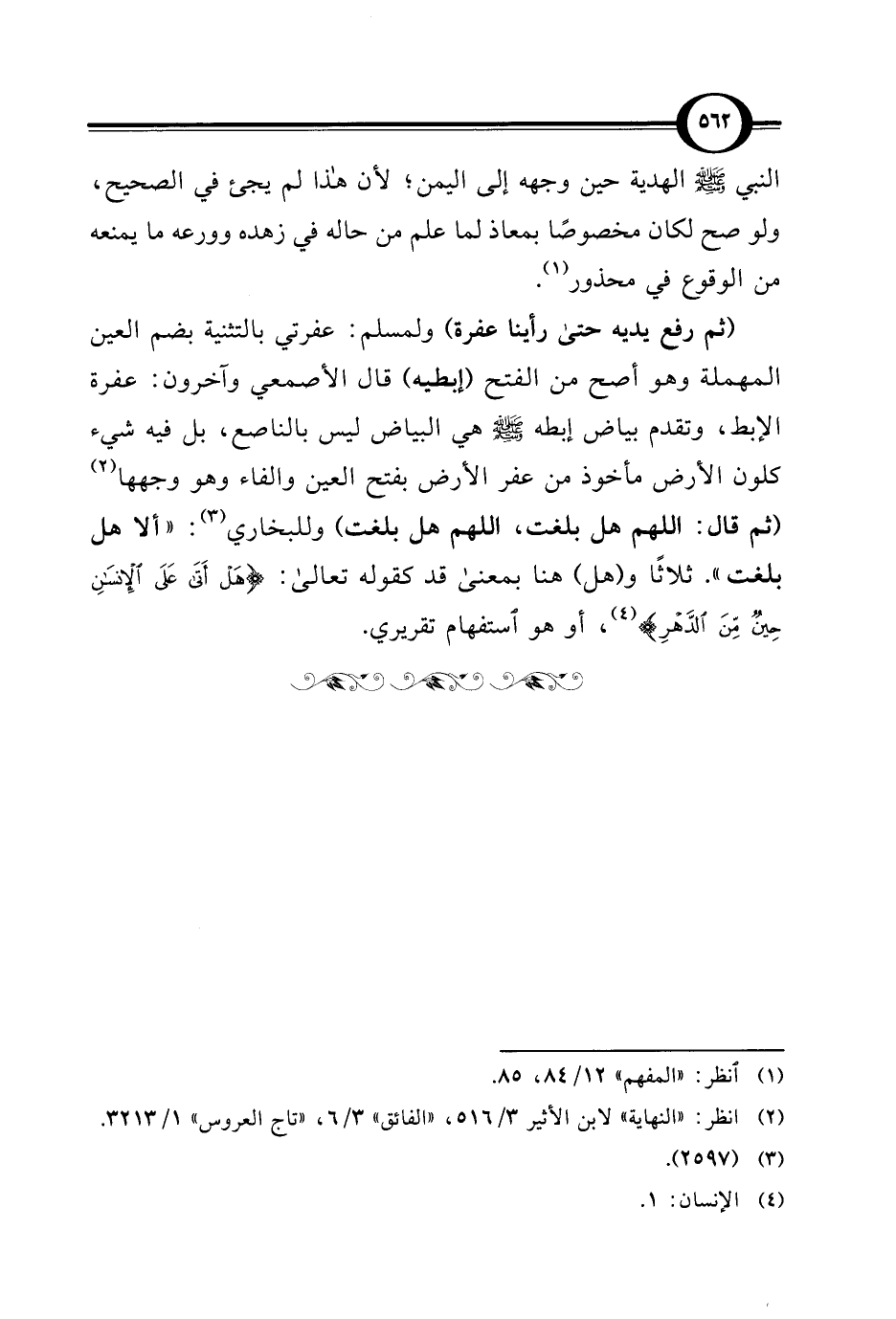 (ثم رفع يديه حتى رأينا عفرة) ولمسلم: عفرتي بالتثنية بضم العين المهملة وهو أصح من الفتح (إبطيه) قال الأصمعي وآخرون: عفرة الإبط، وتقدم بياض إبطه - صلى الله عليه وسلم - هي البياض ليس بالناصع، بل فيه شيء كلون الأرض مأخوذ من عفر الأرض بفتح العين والفاء وهو وجهها (¬2) (ثم قال: اللهم هل بلغت، اللهم هل بلغت) وللبخاري (¬3): "ألا هل بلغت". ثلاثًا و (هل) هنا بمعنى قد كقوله تعالى: {هَلْ أَتَى عَلَى الْإِنْسَانِ حِينٌ مِنَ الدَّهْرِ} (¬4)، أو هو استفهام تقريري.