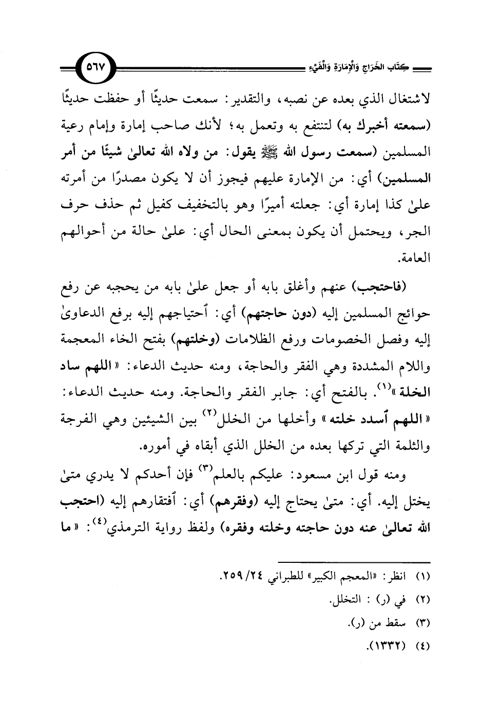 ومنه قول ابن مسعود: عليكم بالعلم (¬3) فإن أحدكم لا يدري متى يختل إليه. أي: متى يحتاج إليه (وفقرهم) أي: افتقارهم إليه (احتجب الله تعالى عنه دون حاجته وخلته وفقره) ولفظ رواية الترمذي (¬4): " ما