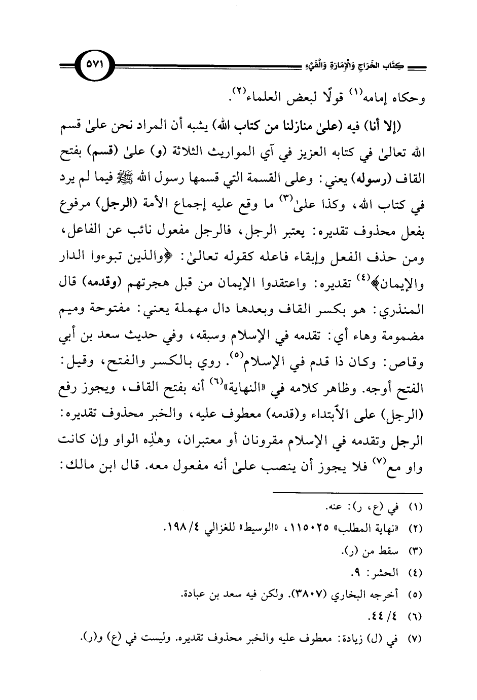 (إلا أنا) فيه (على منازلنا من كتاب الله) يشبه أن المراد نحن على قسم الله تعالى في كتابه العزيز في آي المواريث الثلاثة (و) على (قسم) بفتح القاف (رسوله) يعني: وعلى القسمة التي قسمها رسول الله - صلى الله عليه وسلم - فيما لم يرد في كتاب الله، وكذا على (¬3) ما وقع عليه إجماع الأمة (الرجل) مرفوع بفعل محذوف تقديره: يعتبر الرجل، فالرجل مفعول نائب عن الفاعل، ومن حذف الفعل وإبقاء فاعله كقوله تعالى: {وَالَّذِينَ تَبَوَّءُوا الدَّارَ وَالْإِيمَانَ} (¬4) تقديره: واعتقدوا الإيمان من قبل هجرتهم (وقدمه) قال المنذري: هو بكسر القاف وبعدها دال مهملة يعني: مفتوحة وميم مضمومة وهاء أي: تقدمه في الإسلام وسبقه، وفي حديث سعد بن أبي وقاص: وكان ذا قدم في الإسلام (¬5). روي بالكسر والفتح، وقيل: الفتح أوجه. وظاهر كلامه في "النهاية" (¬6) أنه بفتح القاف، ويجوز رفع (الرجل) على الابتداء و (قدمه) معطوف عليه، والخبر محذوف تقديره: الرجل وتقدمه في الإسلام مقرونان أو معتبران، وهذِه الواو وإن كانت واو مع (¬7) فلا يجوز أن ينصب على أنه مفعول معه. قال ابن مالك:
