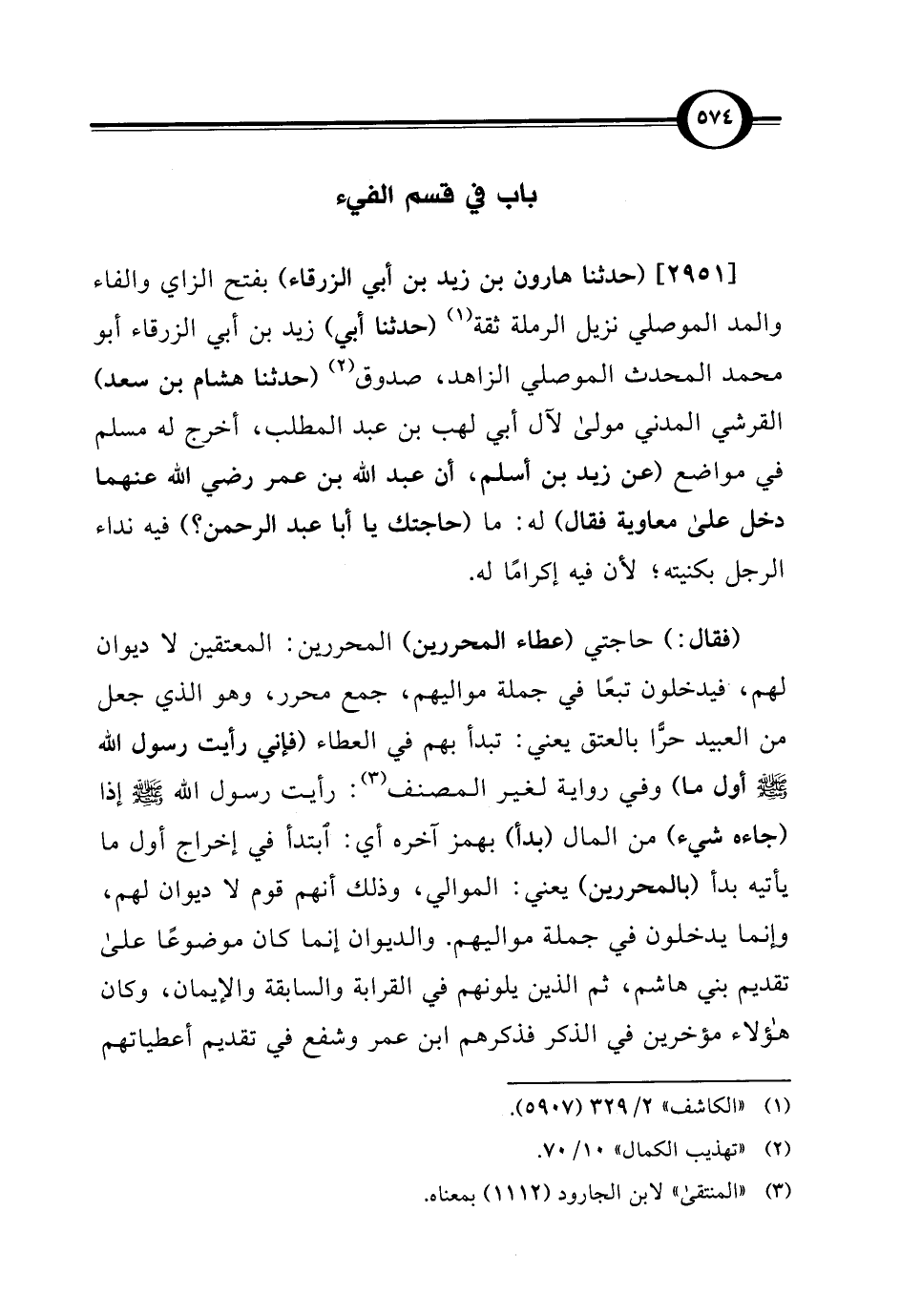 [2951] (حدثنا هارون بن زيد بن أبي الزرقاء) بفتح الزاي والفاء والمد الموصلي نزيل الرملة ثقة (¬1) (حدثنا أبي) زيد بن أبي الزرقاء أبو محمد المحدث الموصلي الزاهد، صدوق (¬2) (حدثنا هشام بن سعد) القرشي المدني مولى لآل أبي لهب بن عبد المطلب، أخرج له مسلم في مواضع (عن زيد بن أسلم، أن عبد الله بن عمر رضي الله عنهما دخل على معاوية فقال) له: ما (حاجتك يا أبا عبد الرحمن؟ ) فيه نداء الرجل بكنيته؛ لأن فيه إكرامًا له.