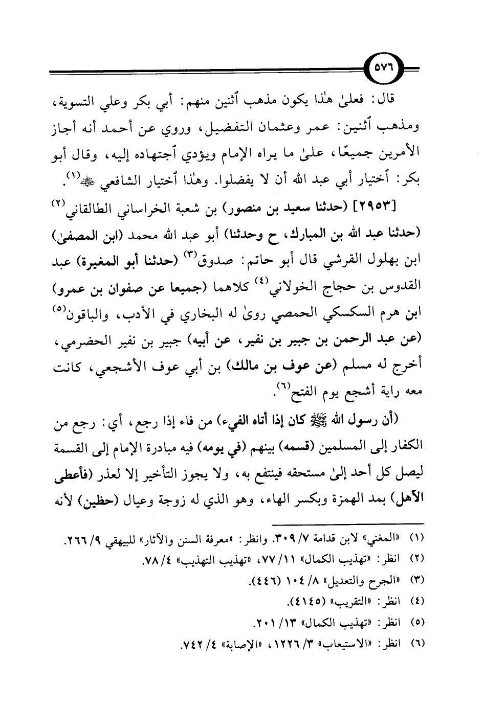 [2953] (حدثنا سعيد بن منصور) بن شعبة الخراساني الطالقاني (¬2) (حدثنا عبد الله بن المبارك، ح وحدثنا) أبو عبد الله محمد (ابن المصفى) ابن بهلول القرشي قال أبو حاتم: صدوق (¬3) (حدثنا أبو المغيرة) عبد القدوس بن حجاج الخولاني (¬4) كلاهما (جميعا عن صفوان بن عمرو) ابن هرم السكسكي الحمصي روى له البخاري في الأدب، والباقون (¬5) (عن عبد الرحمن بن جبير بن نفير، عن أبيه) جبير بن نفير الحضرمي، أخرج له مسلم (عن عوف بن مالك) بن أبي عوف الأشجعي، كانت معه راية أشجع يوم الفتح (¬6).