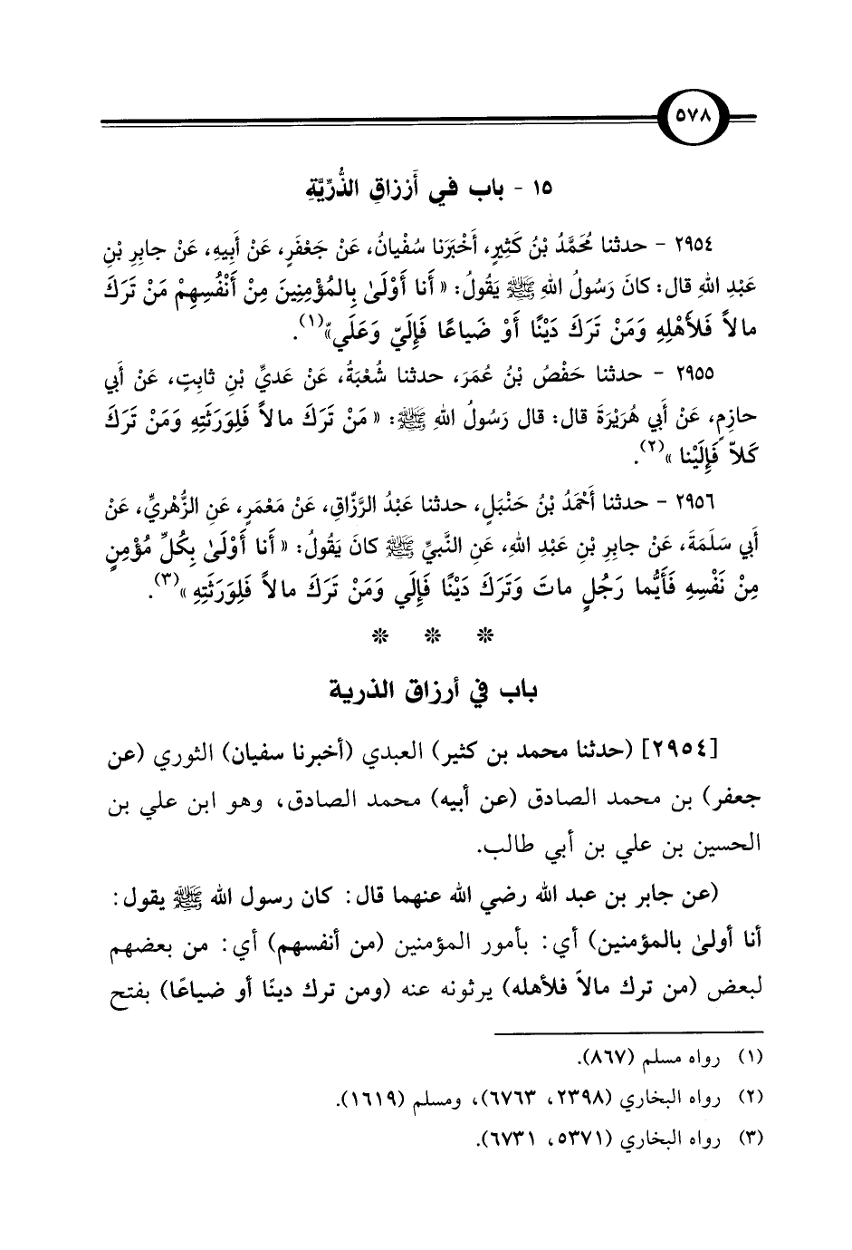 2954 - حدثنا مُحَمَّدُ بْنُ كَثِيرٍ، أَخْبَرَنا سُفْيانُ، عَنْ جَعْفَرٍ، عَنْ أَبِيهِ، عَنْ جابِرِ بْنِ عَبْدِ اللهِ قال: كانَ رَسُولُ اللهِ - صلى الله عليه وسلم - يَقُولُ: "أَنا أَوْلَى بِالمُؤْمِنِينَ مِنْ أَنْفُسِهِمْ مَنْ تَرَكَ مالاً فَلأَهْلِهِ وَمَنْ تَرَكَ دَيْنًا أَوْ ضَياعًا فَإِلَيّ وَعَلَيّ" (¬1).