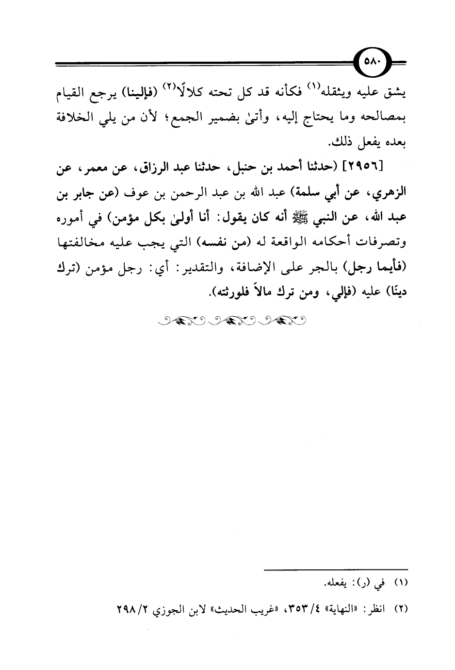 [2956] (حدثنا أحمد بن حنبل، حدثنا عبد الرزاق، عن معمر، عن الزهري، عن أبي سلمة) عبد الله بن عبد الرحمن بن عوف (عن جابر بن عبد الله، عن النبي - صلى الله عليه وسلم - أنه كان يقول: أنا أولى بكل مؤمن) في أموره وتصرفات أحكامه الواقعة له (من نفسه) التي يجب عليه مخالفتها (فأيما رجل) بالجر على الإضافة، والتقدير: أي: رجل مؤمن (ترك دينًا) عليه (فإلي، ومن ترك مالاً فلورثته).