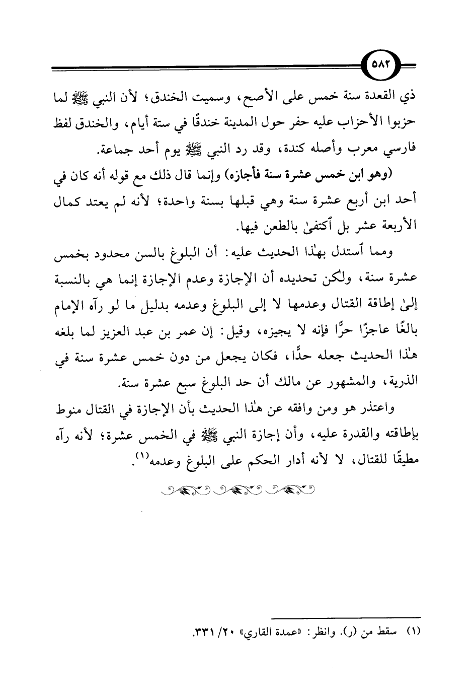 ومما استدل بهذا الحديث عليه: أن البلوغ بالسن محدود بخمس عشرة سنة، ولكن تحديده أن الإجازة وعدم الإجازة إنما هي بالنسبة إلى إطاقة القتال وعدمها لا إلى البلوغ وعدمه بدليل ما لو رآه الإمام بالغًا عاجزًا حرًّا فإنه لا يجيزه، وقيل: إن عمر بن عبد العزيز لما بلغه هذا الحديث جعله حدًّا، فكان يجعل من دون خمس عشرة سنة في الذرية، والمشهور عن مالك أن حد البلوغ سبع عشرة سنة.