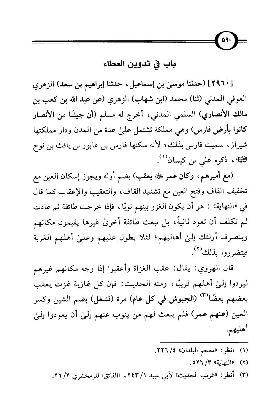[2960] (حدثنا موسى بن إسماعيل، حدثنا إبراهيم بن سعد) الزهري العوفي المدني (ثنا) محمد (ابن شهاب) الزهري (عن عبد الله بن كعب بن مالك الأنصاري) السلمي المدني، أخرج له مسلم (أن جيشًا من الأنصار كانوا بأرض فارس) وهي مملكة تشتمل على عدة من المدن ودار مملكتها شيراز، سميت فارس بذلك؛ لأنه سكنها فارس بن عابور بن يافث بن نوح عليه السلام، ذكره علي بن كيسان (¬1).