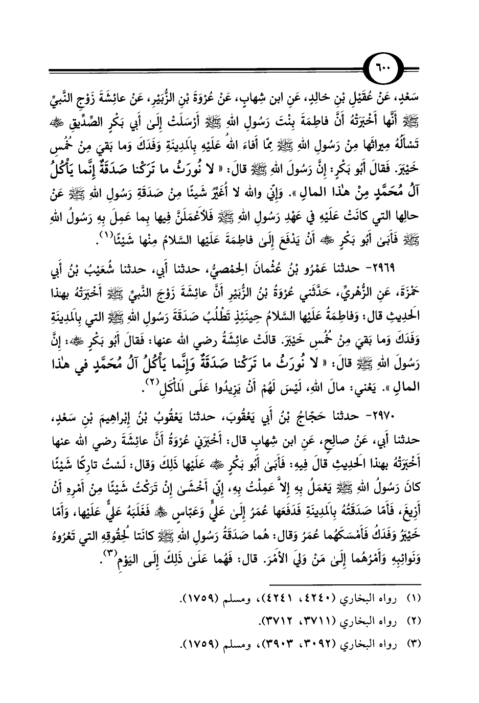 سَعْدٍ، عَنْ عُقَيْلِ بْنِ خالِدٍ، عَنِ ابن شِهابٍ، عَنْ عُرْوَةَ بْنِ الزُّبَيْرِ، عَنْ عائِشَةَ زَوْجِ النَّبيِّ - صلى الله عليه وسلم - أَنَّها أَخْبَرَتْهُ أَنَّ فاطِمَةَ بِنْتَ رَسُولِ اللهِ - صلى الله عليه وسلم - أَرْسَلَتْ إِلَى أَبِي بَكْرٍ الصِّدِّيقِ -رضي الله عنه- تَسْأَلُهُ مِيراثَها مِنْ رَسُولِ اللهِ - صلى الله عليه وسلم - مِمّا أَفاءَ اللهُ عَلَيْهِ بِالَمدِينَةِ وَفَدَكَ وَما بَقيَ مِنْ خمسِ خَيْبَرَ. فَقالَ أَبُو بَكْرٍ: إِنَّ رَسُولَ اللهِ - صلى الله عليه وسلم - قالَ: " لا نُورَثُ ما تَرَكنا صَدَقَةٌ إِنَّما يَأْكُلُ آلُ مُحَمَّدٍ مِنْ هذا المالِ ". وَإنِّي والله لا أُغَيِّرُ شَيئًا مِنْ صَدَقَةِ رَسُولِ اللهِ - صلى الله عليه وسلم - عَنْ حالِها التي كانَتْ عَلَيْهِ في عَهْدِ رَسُولِ اللهِ - صلى الله عليه وسلم - فَلأعمَلَنَّ فِيها بِما عَمِلَ بِهِ رَسُولُ اللهِ - صلى الله عليه وسلم - فَأَبَى أَبُو بَكْرٍ -رضي الله عنه- أَنْ يَدْفَعَ إِلَى فاطِمَةَ عَلَيها السَّلامُ مِنْها شَيئًا (¬1).