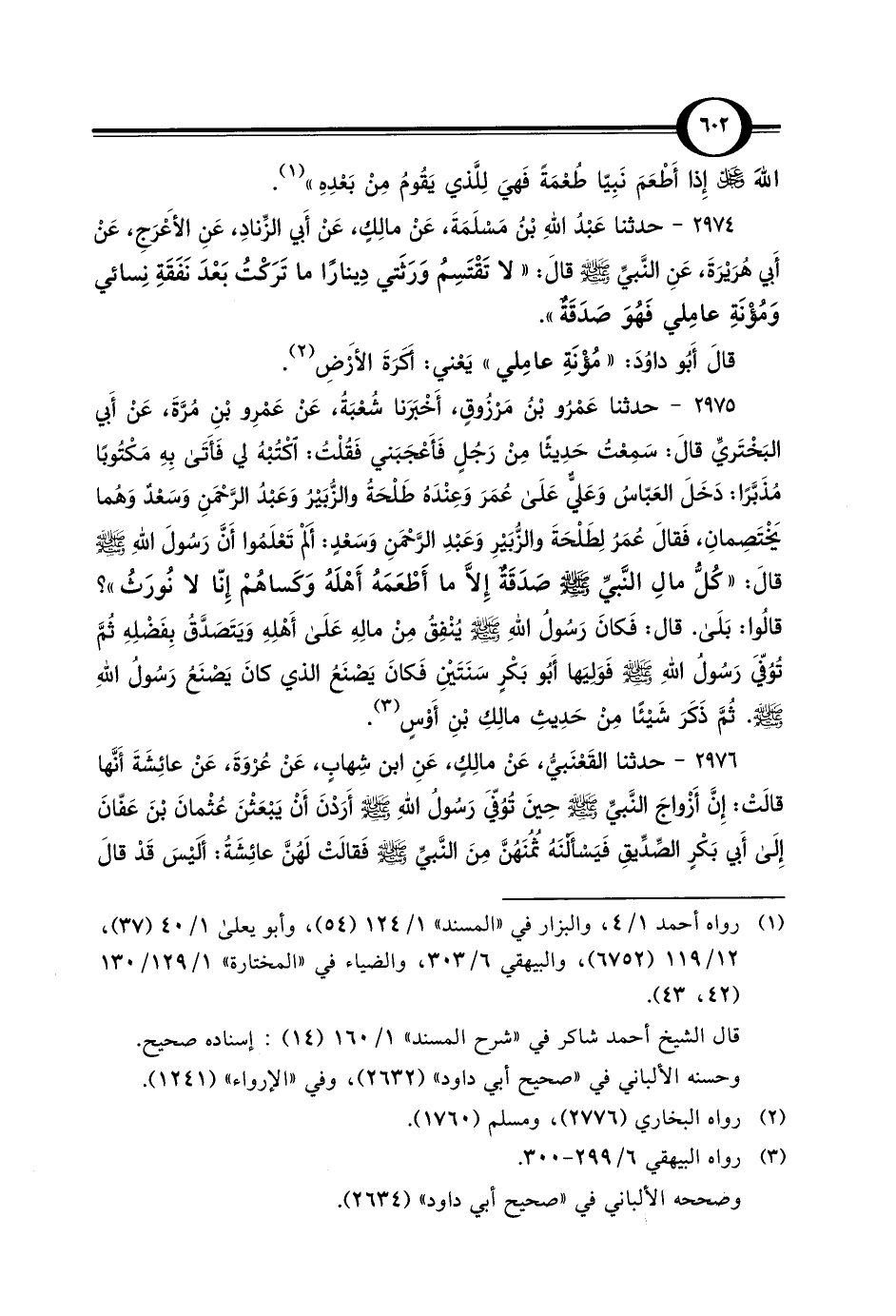 2974 - حدثنا عَبْدُ اللهِ بْنُ مَسْلَمَةَ، عَنْ مالِكٍ، عَنْ أَبي الزِّنادِ، عَنِ الأعرَجِ، عَنْ أَبي هُرَيْرَةَ، عَنِ النَّبيِّ - صلى الله عليه وسلم - قالَ: "لا تَقْتَسِمُ وَرَثَتي دِينارًا ما تَرَكْتُ بَعْدَ نَفَقَةِ نِسائي وَمُوْنَةِ عامِلي فَهُوَ صَدَقَهٌ".