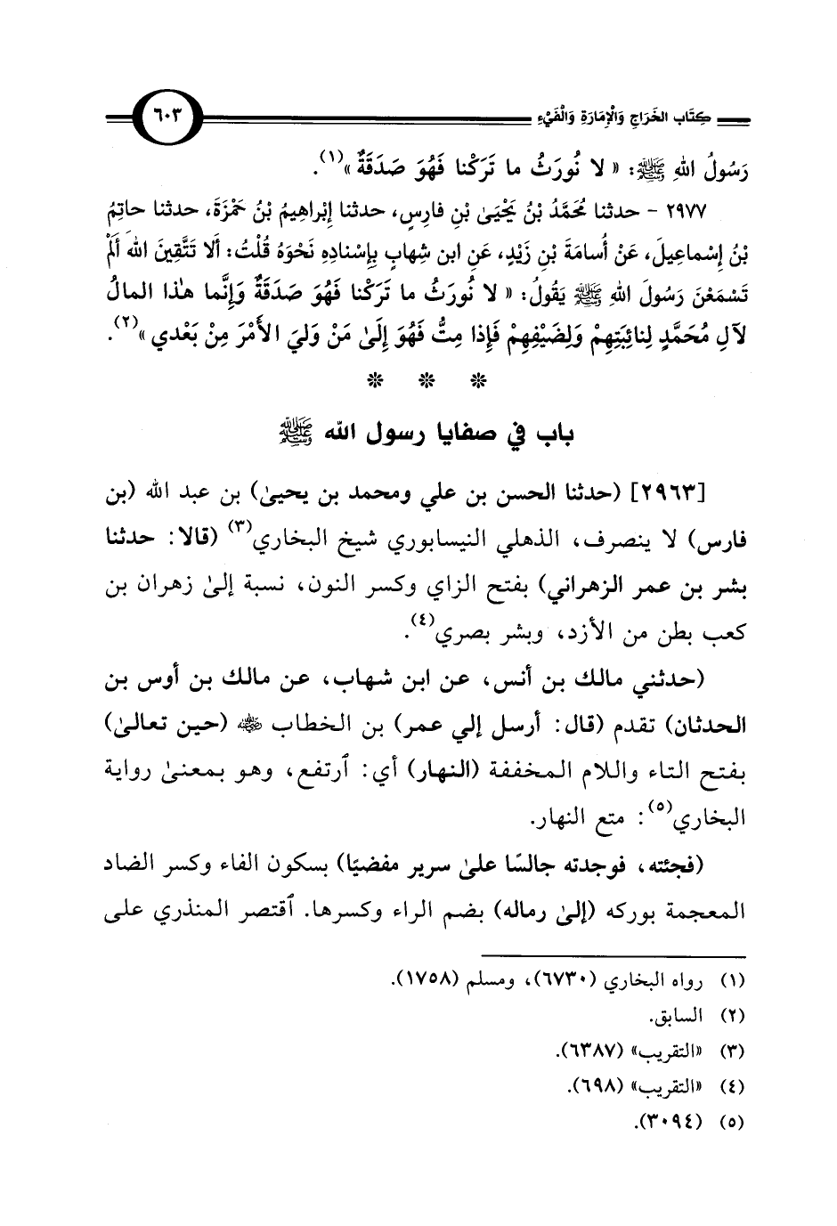 2977 - حدثنا مُحَمَّدُ بْنُ يَحيَى بْنِ فارِسٍ، حدثنا إِبْراهِيمُ بْنُ حَمْزَةَ، حدثنا حاتِمُ بْن إِسْماعِيلَ، عَنْ أُسامَةَ بْنِ زَيْدٍ، عَنِ ابن شِهابٍ بإسْنادِهِ نَحْوَهُ قُلْتُ: أَلا تَتَّقِينَ اللهَ أَلم تَسمَعْنَ رَسُولَ اللهِ - صلى الله عليه وسلم - يَقُولُ: "لا نُورَثُ ما تَرَكنا فَهُوَ صَدَقَه وَإِنَّما هذا المالُ لآلِ مُحَمَّدٍ لِنائِبَتِهِمْ وَلِضَيْفِهِمْ فَإذا مِتُّ فَهُوَ إِلَى مَنْ وَليَ الأمْرَ مِنْ بَعْدي" (¬2).