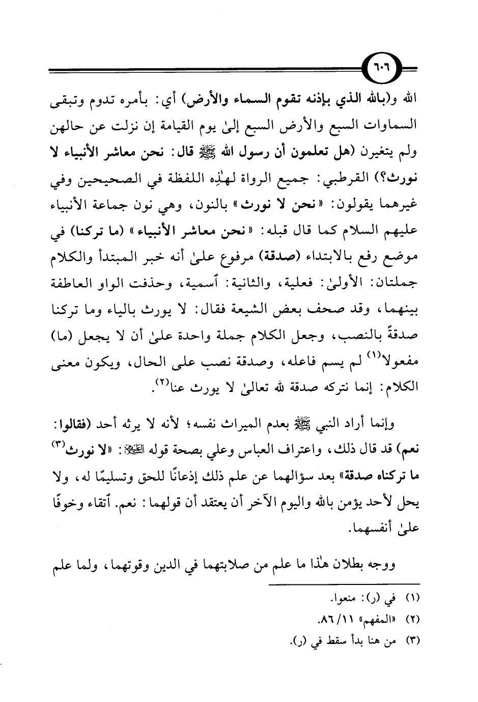 الله و (بالله الذي بإذنه تقوم السماء والأرض) أي: بأمره تدوم وتبقى السماوات السبع والأرض السبع إلى يوم القيامة إن نزلت عن حالهن ولم يتغيرن (هل تعلمون أن رسول الله - صلى الله عليه وسلم - قال: نحن معاشر الأنبياء لا نورث؟ ) القرطبي: جميع الرواة لهذِه اللفظة في الصحيحين وفي غيرهما يقولون: "نحن لا نورث" بالنون، وهي نون جماعة الأنبياء عليهم السلام كما قال قبله: "نحن معاشر الأنبياء" (ما تركنا) في موضع رفع بالابتداء (صدقة) مرفوع على أنه خبر المبتدأ والكلام جملتان: الأولى: فعلية، والثانية: اسمية، وحذفت الواو العاطفة بينهما، وقد صحف بعض الشيعة فقال: لا يورث بالياء وما تركنا صدقةً بالنصب، وجعل الكلام جملة واحدة على أن لا يجعل (ما) مفعولا (¬1) لم يسم فاعله، وصدقة نصب على الحال، ويكون معنى الكلام: إنما نتركه صدقة لله تعالى لا يورث عنا (¬2).