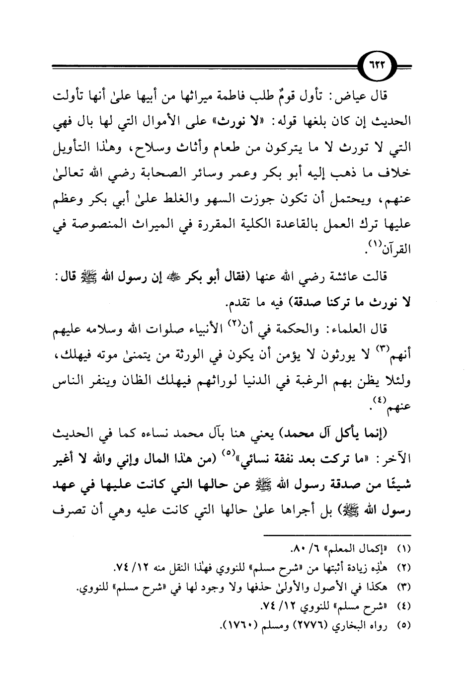قال عياض: تأول قومٌ طلب فاطمة ميراثها من أبيها على أنها تأولت الحديث إن كان بلغها قوله: "لا نورث" على الأموال التي لها بال فهي التي لا تورث لا ما يتركون من طعام وأثاث وسلاح، وهذا التأويل خلاف ما ذهب إليه أبو بكر وعمر وسائر الصحابة - رضي الله تعالى عنهم -، ويحتمل أن تكون جوزت السهو والغلط على أبي بكر وعظم عليها ترك العمل بالقاعدة الكلية المقررة في الميراث المنصوصة في القرآن (¬1).