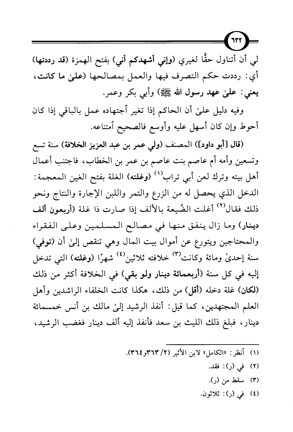 (قال [أبو داود]) المصنف (ولي عمر بن عبد العزيز الخلافة) سنة تسع وتسعين وأمه أم عاصم بنت عاصم بن عمر بن الخطاب، فاجتنب أعمال أهل بيته وترك لعن أبي تراب (¬1) (وغلته) الغلة بفتح الغين المعجمة: الدخل الذي يحصل له من الزرع والتمر واللبن الإجارة والنتاج ونحو ذلك فقال (¬2) أغلت الضَّيعة بالألف إذا صارت ذا غلة (أربعون ألف دينار) وما زال ينفق منها في مصالح المسلمين وعلى الفقراء والمحتاجين ويتورع عن أموال بيت المال وهي تنقص إلى أن (توفي) سنة إحدى ومائة وكانت (¬3) خلافته ثلاثين (¬4) شهرًا (وغلته) التي تدخل إليه في كل سنة (أربعمائة دينار ولو بقي) في الخلافة أكثر من ذلك (لكان) غلة دخله (أقل) من ذلك، هكذا كانت الخلفاء الراشدين وأهل العلم المجتهدين، كما قيل: أنفذ الرشيد إلى مالك بن أنس خمسمائة دينار، فبلغ ذلك الليث بن سعد فأنفذ إليه ألف دينار فغضب الرشيد،