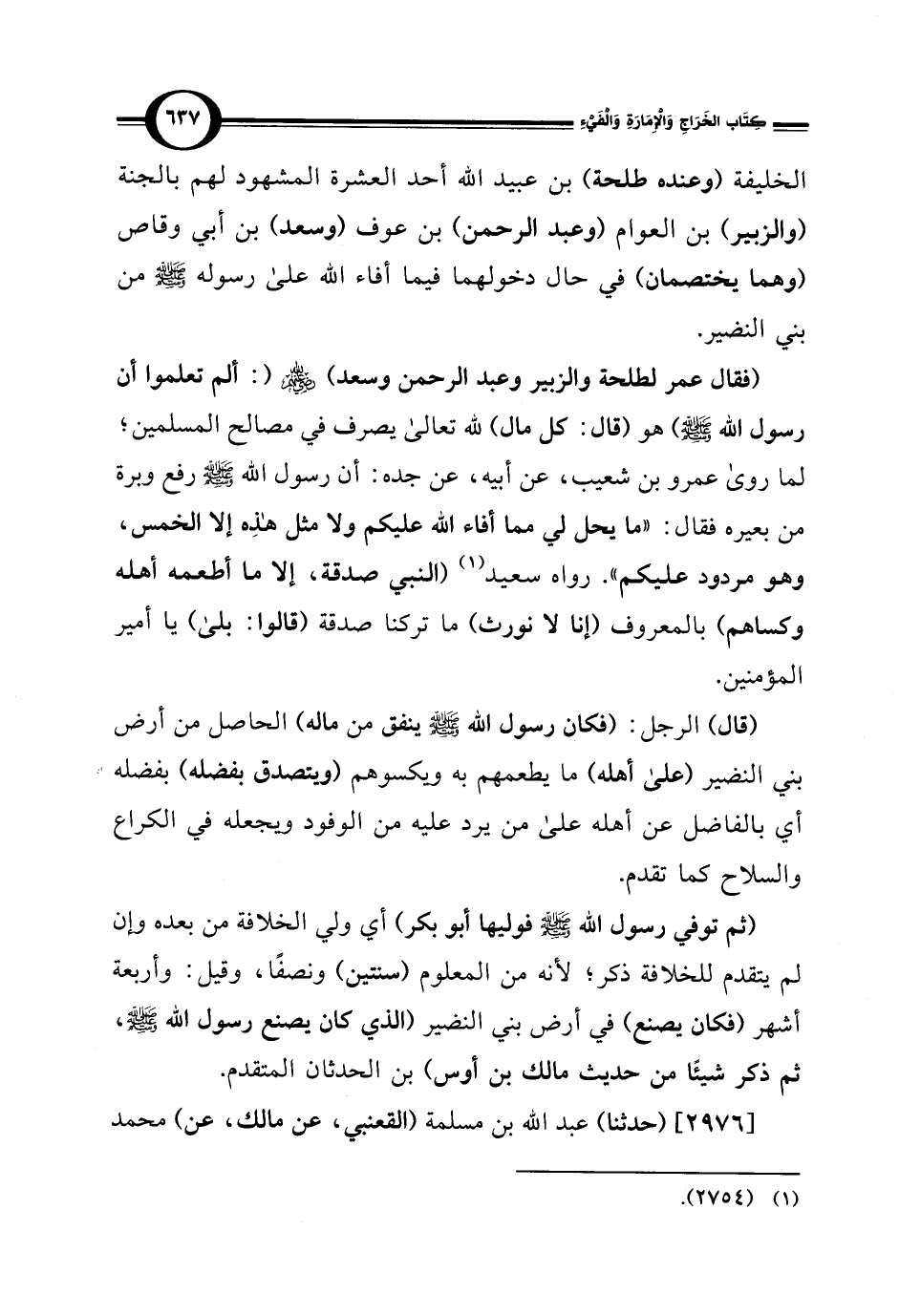 الخليفة (وعنده طلحة) بن عبيد الله أحد العشرة المشهود لهم بالجنة (والزبير) بن العوام (وعبد الرحمن) بن عوف (وسعد) بن أبي وقاص (وهما يختصمان) في حال دخولهما فيما أفاء الله على رسوله - صلى الله عليه وسلم - من بني النضير.
