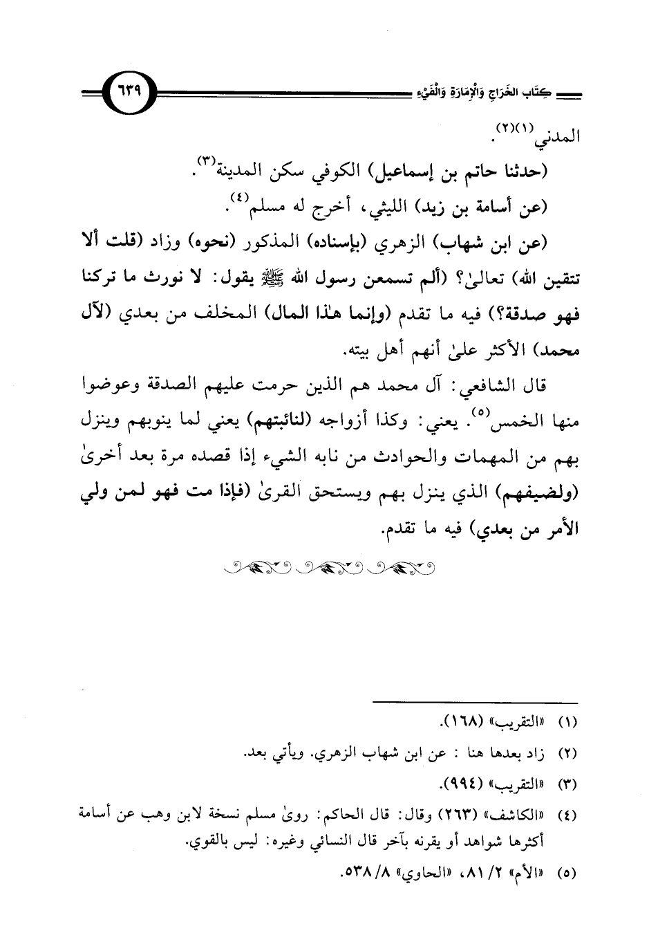 (¬4) "الكاشف" (263) وقال: قال الحاكم: روى مسلم نسخة لابن وهب عن أسامة أكثرها شواهد أو يقرنه بآخر قال النسائي وغيره: ليس بالقوي.