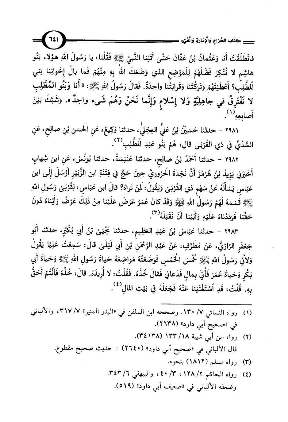 2982 - حدثنا أَحْمَدُ بْنُ صالِحٍ، حدثنا عَنْبَسَةُ، حدثنا يُونُسُ، عَنِ ابن شِهابٍ أَخْبَرَني يَزِيدُ بْنُ هُرمُزَ أَنَّ نَجْدَةَ الحَرُوريَّ حِينَ حَجَّ في فِتْنَةِ ابن الزُّبَيْرِ أَرْسَلَ إِلَى ابن عَبّاسٍ يَسْألهُ عَنْ سَهْمِ ذي القُرْبَى وَيَقولُ: لَمِنْ تَراهُ؟ قالَ ابن عَبّاسٍ: لِقُربَى رَسُولِ اللهِ - صلى الله عليه وسلم - قسَمَهُ لَهُمْ رَسولُ اللهِ - صلى الله عليه وسلم - وَقَدْ كانَ عُمَرُ عَرَضَ عَلَيْنا مِنْ ذَلِكَ عَرضًا رَأَيْناهُ دُونَ حَقِّنا فَرَدَدْناهُ عَلَيْهِ وَأَبَيْنا أَنْ نَقْبَلَهُ (¬3).