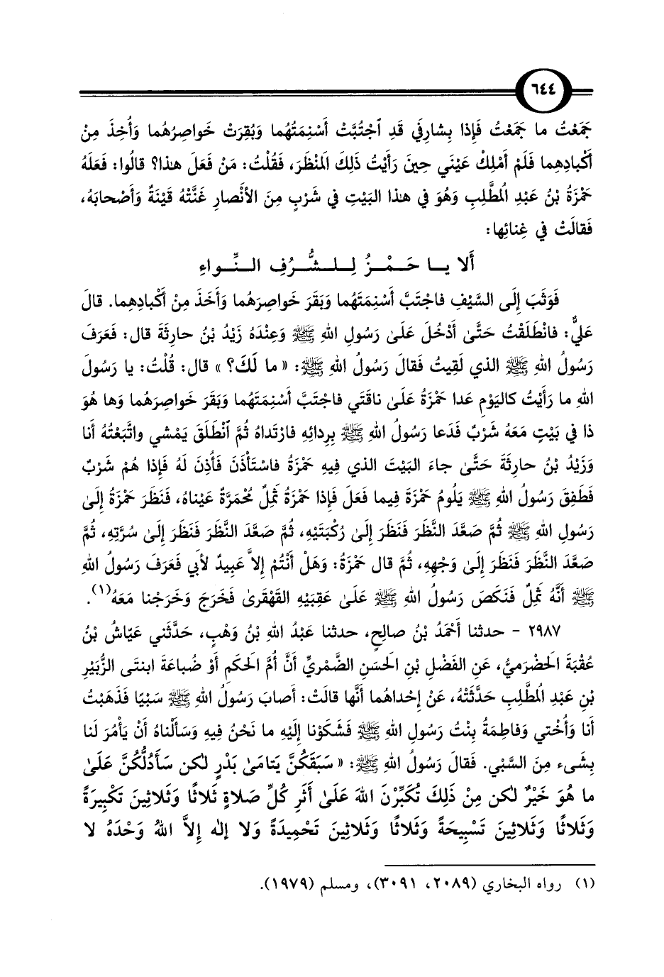 2987 - حدثنا أَحْمَدُ بْنُ صالِحٍ، حدثنا عَبْدُ اللهِ بْنُ وَهْبٍ، حَدَّثَني عَيّاشُ بْنُ عُقْبَةَ الحَضْرَميُّ، عَنِ الفَضْلِ بْنِ الحَسَنِ الضَّمْريِّ أَنَّ أُمَّ الحَكَمِ أَوْ ضُباعَةَ ابنتَى الزُّبَيْرِ بْنِ عَبْدِ المُطَّلِبِ حَدَّثَتْهُ، عَنْ إِحْداهُما أنَها قالَتْ: أَصابَ رَسُولُ اللهِ - صلى الله عليه وسلم - سَبْيًا فَذَهَبْتُ أَنا وَأُخْتي وَفاطِمَةُ بِنْتُ رَسُولِ اللهِ - صلى الله عليه وسلم - فشَكَوْنا إِلَيْهِ ما نَحْن فِيهِ وَسَألناهُ أَنْ يَأْمُرَ لَنا بِشَيء مِنَ السَّبْي. فَقالَ رَسُولُ اللهِ - صلى الله عليه وسلم -: "سَبَقَكُنَّ يَتامَى بَدْرٍ لكن سَأَدُلُّكُنَّ عَلَى ما هُوَ خَيْرٌ لكن مِنْ ذَلِكَ تُكبِّرْنَ اللهَ عَلَى أَثَرِ كُلِّ صَلاةٍ ثَلاثًا وَثَلاثِينَ تَكبِيرَةً وَثَلاثًا وَثَلاثِينَ تَسْبِيحَةً وَثَلاثًا وَثَلاثِينَ تَحْمِيدَةً وَلا إله إِلاَّ اللهُ وَحْدَهُ لا