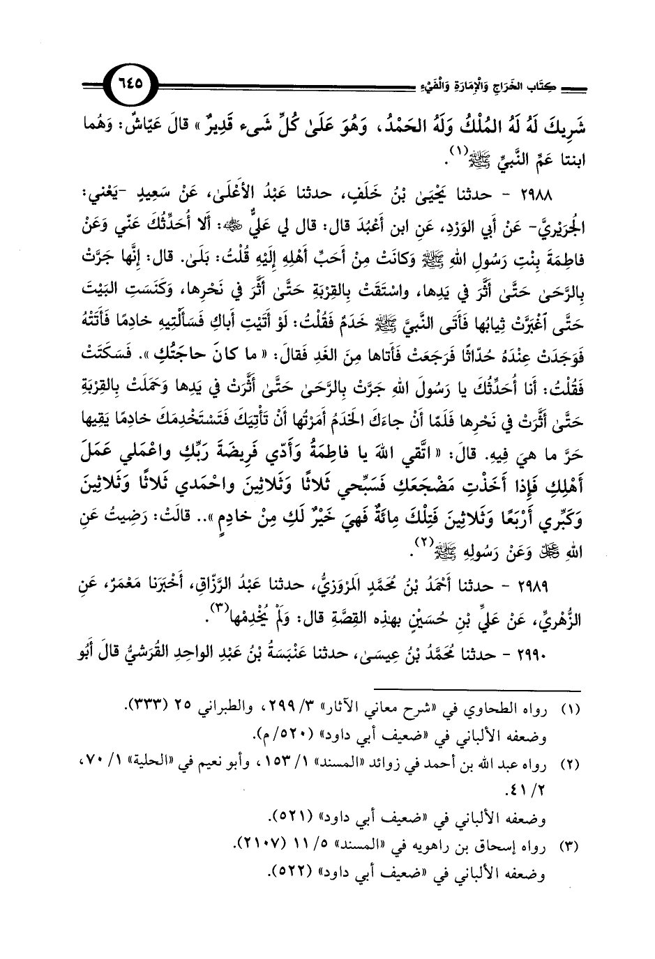 2988 - حدثنا يحيَى بْن خَلَفٍ، حدثنا عَبْدُ الأعلَى، عَنْ سَعِيدٍ -يَعْني: الجُرَيْريَّ- عَنْ أَبي الوَرْدِ، عَنِ ابن أَعْبُدَ قال: قال لي عَليٌّ -رضي الله عنه-: أَلا أُحَدِّثُكَ عَنّي وَعَنْ فاطِمَةَ بِنْتِ رَسُولِ اللْهِ - صلى الله عليه وسلم - وَكانَتْ مِنْ أَحَبِّ أَهْلِهِ إِلَيْهِ قُلْتُ: بَلَى. قال: إِنَّها جَرَّتْ بِالرَّحَى حَتَّى أثَّرَ في يَدِها، واسْتَقَتْ بِالقِربَةِ حَتَّى أثَّرَ في نَحْرِها، وَكنَسَتِ البَيْتَ حَتَّى اغْبَرَّتْ ثِيابُها فَأَتَى النَّبيَّ - صلى الله عليه وسلم - خَدَمٌ فَقُلْتُ: لَوْ أَتَيْتِ أَباكِ فَسَألتِيهِ خادِمًا فَأَتَتْهُ فَوَجَدَتْ عِنْدَهُ حُدّاثًا فَرَجَعَتْ فَأَتاها مِنَ الغَدِ فَقالَ: "ما كانَ حاجَتُكِ". فَسَكَتَتْ فَقُلْت: أَنا أُحَدِّثُكَ يا رَسُولَ اللهِ جَرَّتْ بِالرَّحَى حَتَّى أثَرَتْ في يَدِها وَحَمَلَتْ بِالقِرْبَةِ حَتَّى أثَرَتْ في نَحْرِها فَلَمّا أَنْ جاءَكَ الَخدَمُ أَمَرتُها أَنْ تَأْتِيَكَ فَتَسْتَخْدِمَكَ خادِمًا يَقِيها حَرَّ ما هيَ فِيهِ. قالَ: "اتَّقي اللهَ يا فاطِمَةُ وَأَدّي فَرِيضَةَ رَبّكِ واعْمَلي عَمَلَ أَهْلِكِ فَإذا أَخَذْتِ مَضْجَعَكِ فَسَبِّحي ثَلاثًا وَثَلاثِينَ واحْمَدي ثَلاثًا وَثَلاثِينَ وَكَبِّري أَرْبَعًا وَثَلاثِينَ فَتِلْكَ مِائَةٌ فَهيَ خَيْرٌ لَكِ مِنْ خادِمٍ" .. قالَتْ: رَضِيتُ عَنِ اللهِ - عز وجل - وَعَنْ رَسُولِهِ - صلى الله عليه وسلم - (¬2).