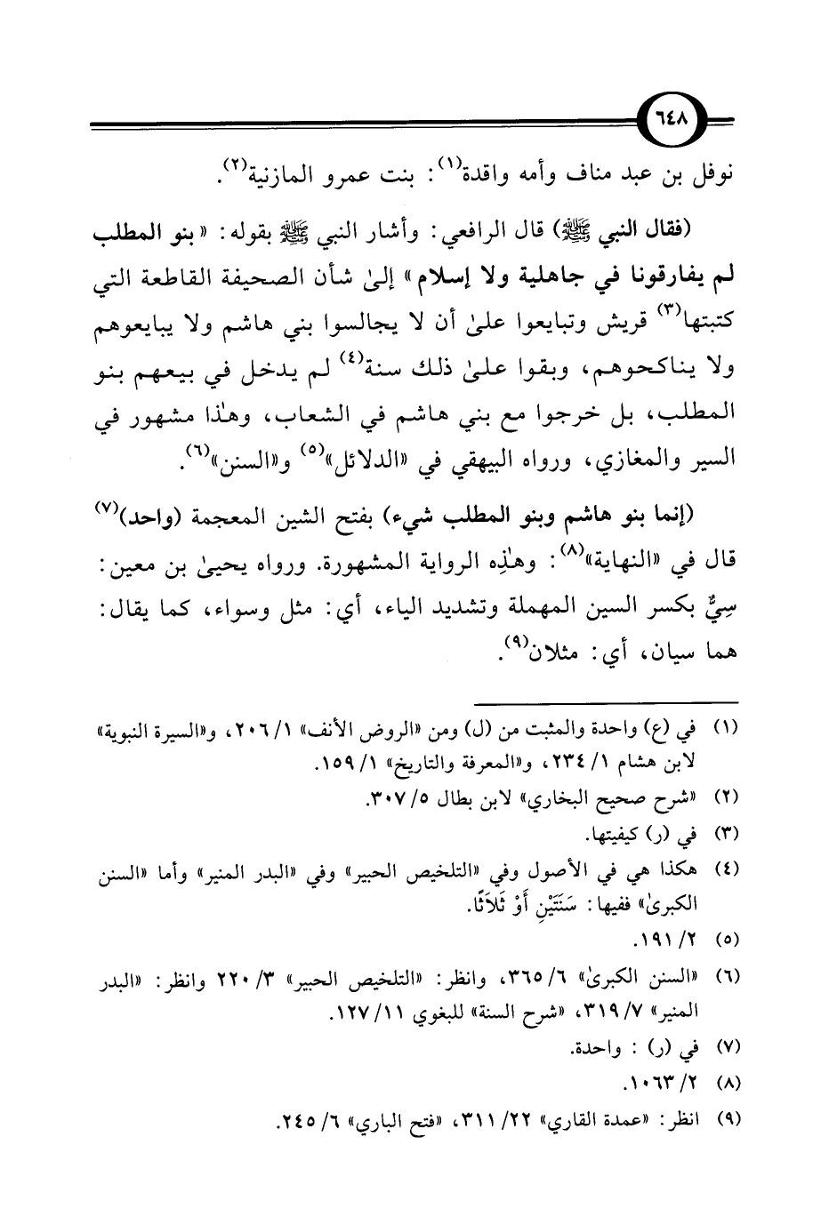 (فقال النبي - صلى الله عليه وسلم - قال الرافعي: وأشار النبي - صلى الله عليه وسلم - بقوله: "بنو المطلب لم يفارقونا في جاهلية ولا إسلام" إلى شأن الصحيفة القاطعة التي كتبتها (¬3) قريش وتبايعوا على أن لا يجالسوا بني هاشم ولا يبايعوهم ولا يناكحوهم، وبقوا على ذلك سنة (¬4) لم يدخل في بيعهم بنو المطلب، بل خرجوا مع بني هاشم في الشعاب، وهذا مشهور في السير والمغازي، ورواه البيهقي في "الدلائل" (¬5) و"السنن" (¬6).