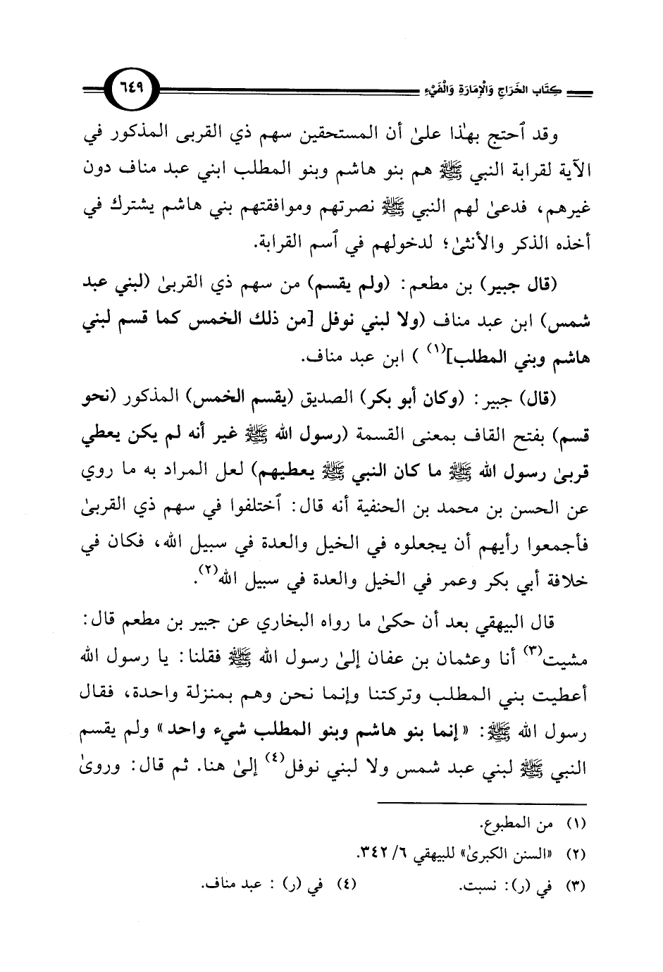 قال البيهقي بعد أن حكى ما رواه البخاري عن جبير بن مطعم قال: مشيت (¬3) أنا وعثمان بن عفان إلى رسول الله - صلى الله عليه وسلم - فقلنا: يا رسول الله أعطيت بني المطلب وتركتنا وإنما نحن وهم بمنزلة واحدة، فقال رسول الله - صلى الله عليه وسلم -: "إنما بنو هاشم وبنو المطلب شيء واحد" ولم يقسم النبي - صلى الله عليه وسلم - لبني عبد شمس ولا لبني نوفل (¬4) إلى هنا. ثم قال: وروى