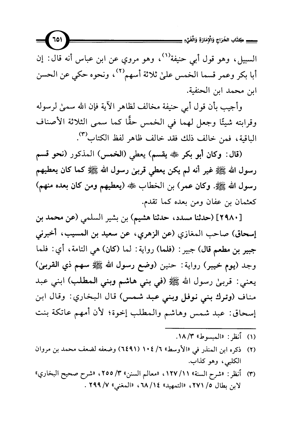[2980] (حدثنا مسدد، حدثنا هشيم) بن بشير السلمي (عن محمد بن إسحاق) صاحب المغازي (عن الزهري، عن سعيد بن المسيب، أخبرني جبير بن مطعم قال) جبير: (فلما) رواية: لما (كان) هي التامة، أي: فلما وجد (يوم خيبر) رواية: حنين (وضع رسول الله - صلى الله عليه وسلم - سهم ذي القربى) يعني: قربى رسول الله - صلى الله عليه وسلم - (في بني هاشم وبني المطلب) ابني عبد مناف (وترك بني نوفل وبني عبد شمس) قال البخاري: وقال ابن إسحاق: عبد شمس وهاشم والمطلب إخوة؛ لأن أمهم عاتكة بنت