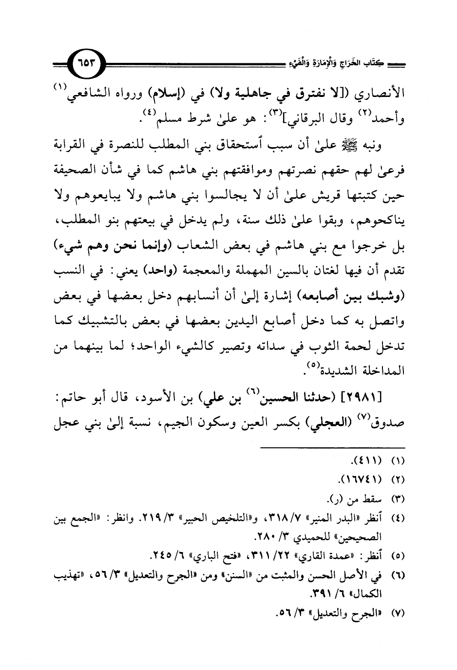 [2981] (حدثنا الحسين (¬6) بن علي) بن الأسود، قال أبو حاتم: صدوق (¬7) (العجلي) بكسر العين وسكون الجيم، نسبة إلى بني عجل