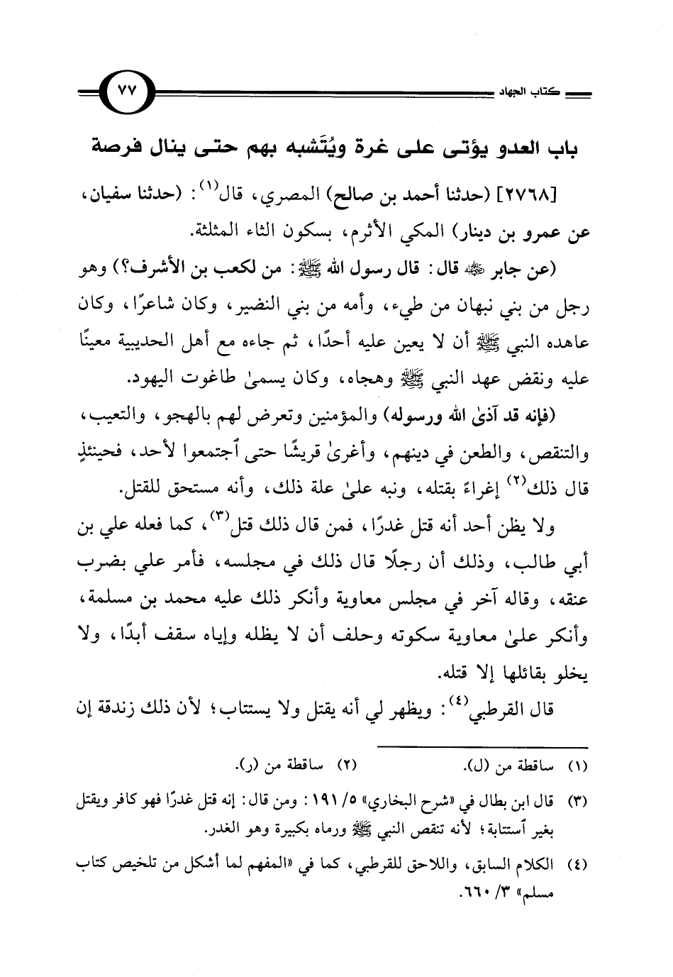 (¬3) قال ابن بطال في "شرح البخاري" 5/ 191: ومن قال: إنه قتل غدرًا فهو كافر ويقتل بغير استتابة؛ لأنه تنقص النبي - صلى الله عليه وسلم - ورماه بكبيرة وهو الغدر.