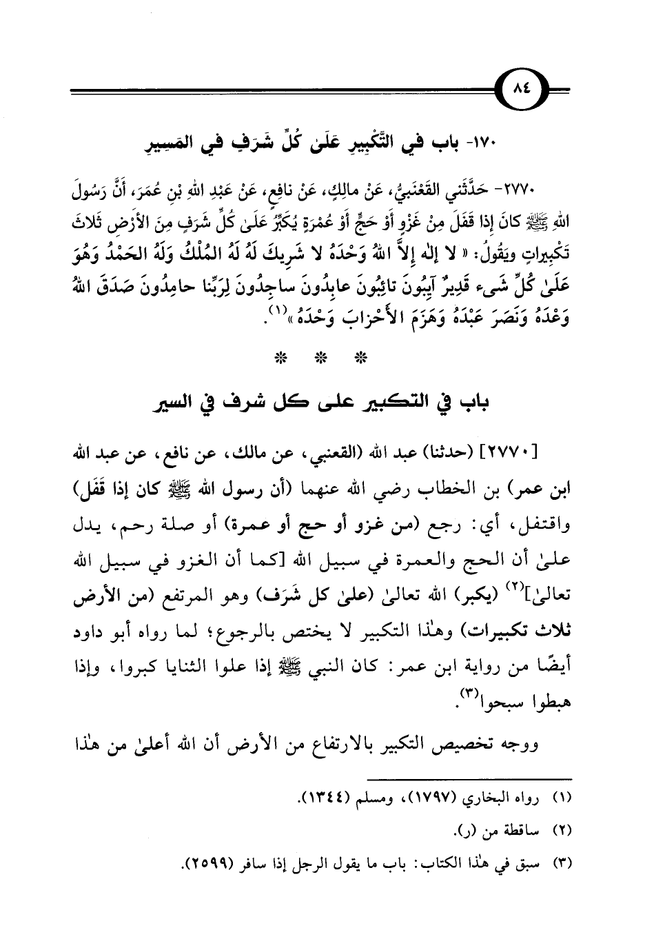 2770 - حَدَّثَني القَعْنَبيُّ، عَنْ مالِكٍ، عَنْ نافِعٍ، عَنْ عَبْدِ اللهِ بْنِ عُمَرَ، أَنَّ رَسُولَ اللهِ - صلى الله عليه وسلم - كانَ إِذا قَفَلَ مِنْ غَزْوٍ أَوْ حَجٍّ أَوْ عُمْرَةٍ يُكَبِّرُ عَلَى كُل شَرَفٍ مِنَ الأرضِ ثَلاثَ تَكْبِيراتٍ ويَقُولُ: "لا إله إِلَّا اللهُ وَحْدَهُ لا شَرِيكَ لَهُ لَهُ المُلْكُ وَلَهُ الحَمْدُ وَهُوَ عَلَى كُلِّ شَيء قَدِيرٌ آيِبُونَ تائِبُونَ عابِدُونَ ساجدُونَ لِرَبِّنا حامِدُونَ صَدَقَ اللهُ وَعْدَهُ وَنَصَرَ عَبْدَهُ وَهَزَمَ الأَحْزابَ وَحْدَهُ" (¬1).