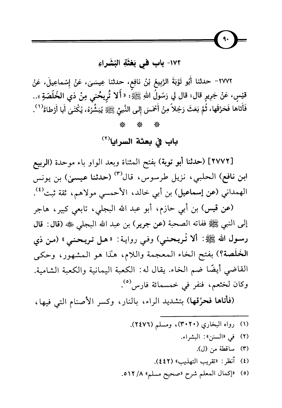 2772 - حدثنا أَبُو تَوْبَةَ الرَّبِيعُ بْنُ نافِعٍ، حدثنا عِيسَى، عَنْ إِسْماعِيلَ، عَنْ قيْسٍ، عَنْ جَرِيرٍ قال: قال لي رَسُولُ اللهِ - صلى الله عليه وسلم -: "أَلا تُرِيحُني مِنْ ذي الخَلَصَةِ" .. فَأَتاها فَحَرَّقَها، ثمَّ بَعَثَ رَجُلاً مِنْ أَحْمَسَ إِلى النَّبيِّ - صلى الله عليه وسلم - يُبَشِّرُهُ، يُكْنَى أَبا أَرْطاةَ (¬1).