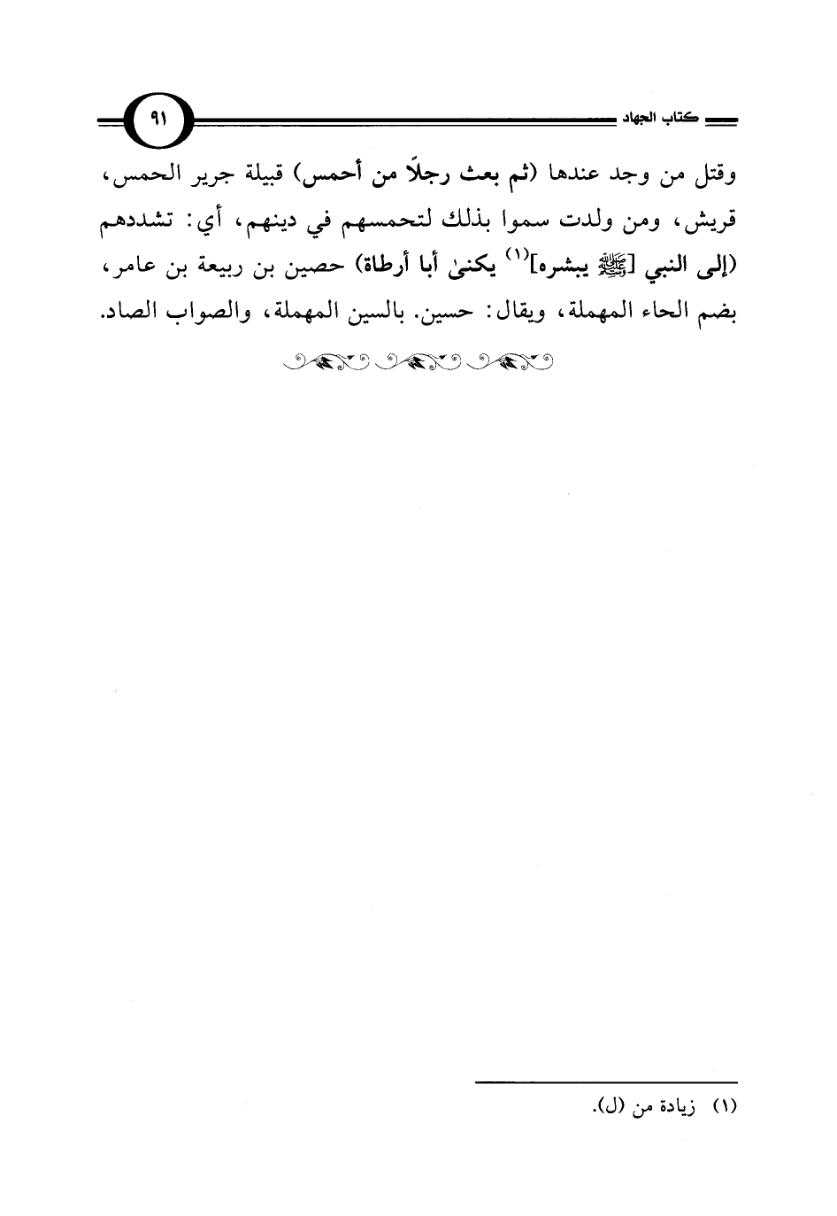 وقتل من وجد عندها (ثم بعث رجلًا من أحمس) قبيلة جرير الحمس، قريش، ومن ولدت سموا بذلك لتحمسهم في دينهم، أي: تشددهم (إلى النبي - صلى الله عليه وسلم - يبشره] (¬1) يكنى أبا أرطاة) حصين بن ربيعة بن عامر، بضم الحاء المهملة، ويقال: حسين. بالسين المهملة، والصواب الصاد.