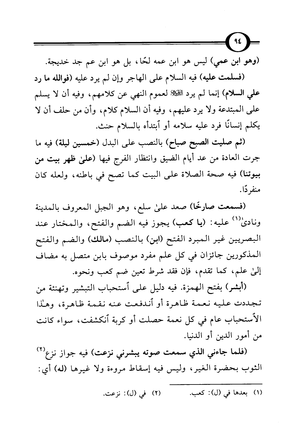 (فسمعت صارخا) صعد على سلع، وهو الجبل المعروف بالمدينة ونادى (¬1) عليه: (يا كعب) يجوز فيه الضم والفتح، والمختار عند البصريين غير المبرد الفتح (ابن) بالنصب (مالك) والضم والفتح المذكورين جائزان في كل علم مفرد موصوف بابن متصل به مضاف إلى علم، كما تقدم، فإن فقد شرط تعين ضم كعب ونحوه.