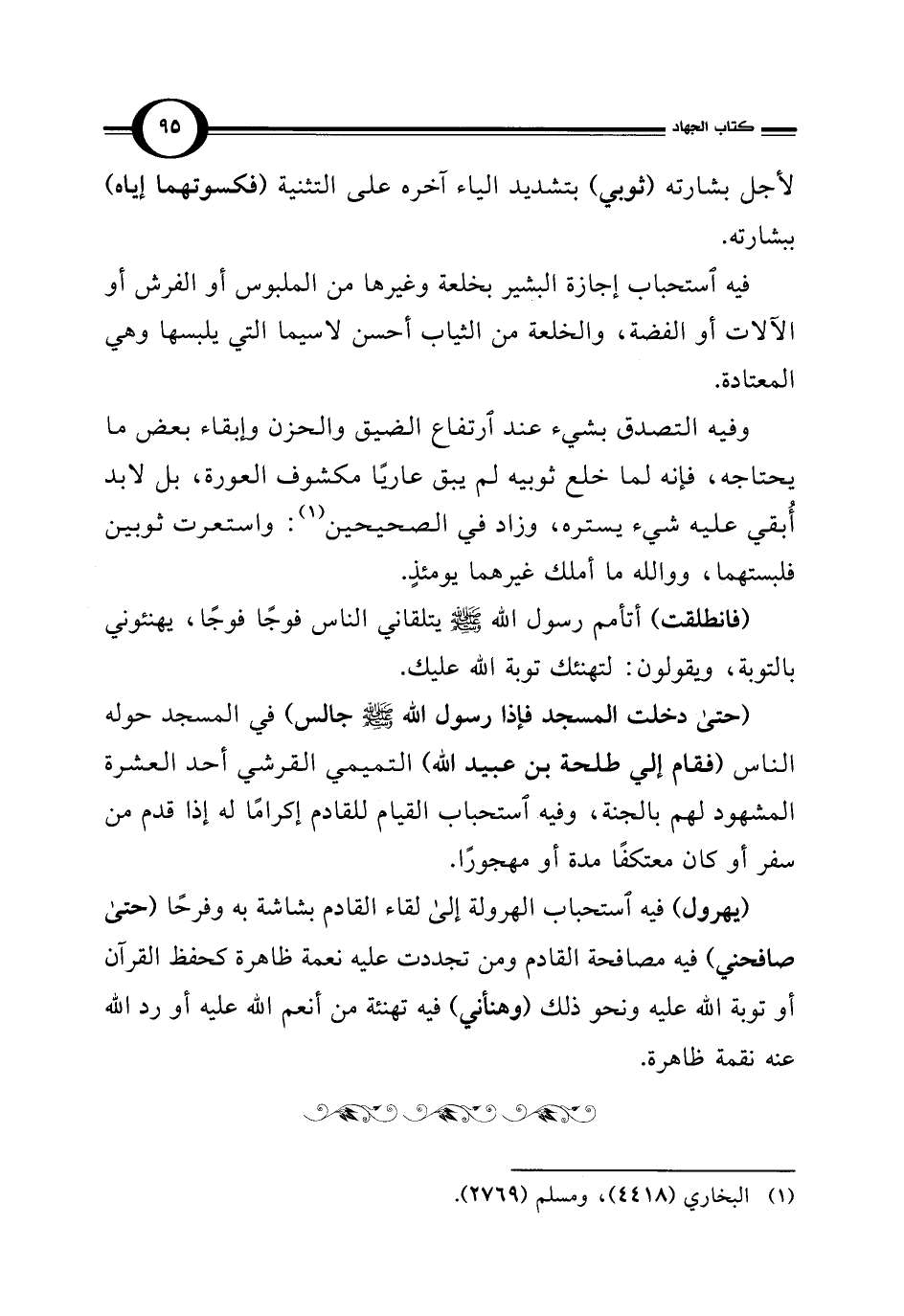 (حتى دخلت المسجد فإذا رسول الله - صلى الله عليه وسلم - جالس) في المسجد حوله الناس (فقام إلى طلحة بن عبيد الله) التميمي القرشي أحد العشرة المشهود لهم بالجنة، وفيه استحباب القيام للقادم إكرامًا له إذا قدم من سفر أو كان معتكفًا مدة أو مهجورًا.