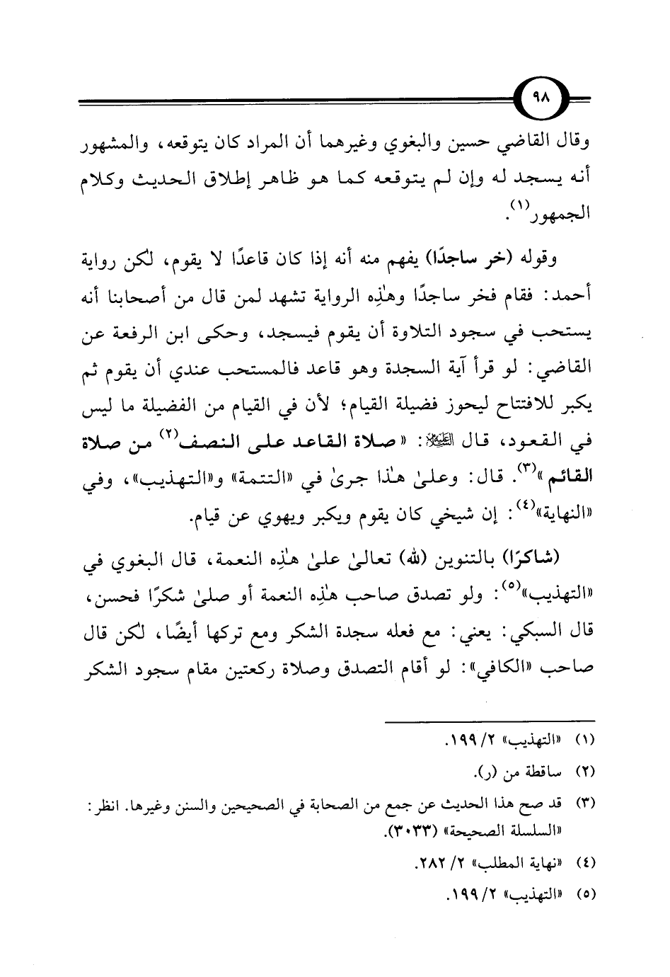 (شاكرًا) بالتنوين (لله) تعالى على هذِه النعمة، قال البغوي في "التهذيب" (¬5): ولو تصدق صاحب هذِه النعمة أو صلى شكرًا فحسن، قال السبكي: يعني: مع فعله سجدة الشكر ومع تركها أيضًا، لكن قال صاحب "الكافي": لو أقام التصدق وصلاة ركعتين مقام سجود الشكر