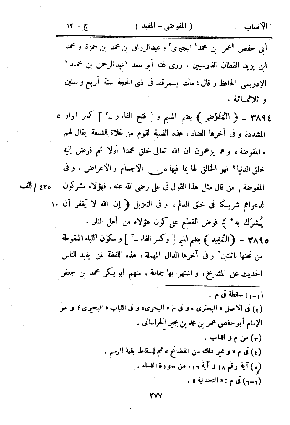 بضم الميم و [فتح الفاء و [3]] كسر الواو المشددة وفي آخرها الضاد، هذه النسبة لقوم من غلاة الشيعة يقال لهم «المفوضة» وهم يزعمون أن الله تعالى خلق محمدا أولا ثم فوض إليه خلق الدنيا [4] فهو الخالق لها بما فيها من الأجسام والأعراض، وفي المفوضة/ من قال مثل هذا القول في على رضى الله عنه، فهؤلاء مشركون لدعواهم شريكا في خلق العالم، وفي التنزيل إِنَّ الله لا يَغْفِرُ أَنْ يُشْرَكَ به [5] 4: 48 فوض القطع على كون هؤلاء من أهل النار.