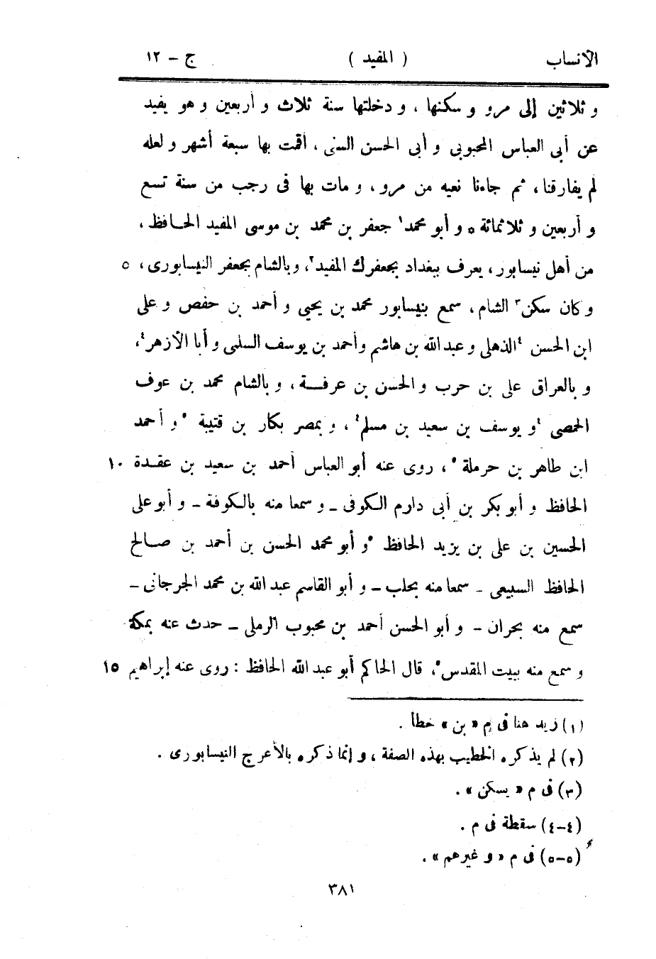 وثلاثين إلى مرو وسكنها، ودخلتها سنة ثلاث وأربعين وهو يفيد عن أبى العباس المحبوبي وأبى الحسن السنى، أقمت بها سبعة أشهر ولعله لم يفارقنا، ثم جاءنا نعيه من مرو، ومات بها في رجب من سنة تسع وأربعين وثلاثمائة وأبو محمد [1] جعفر بن محمد بن موسى المفيد الحافظ، من أهل نيسابور، يعرف ببغداد بجعفرك المفيد [2] ، وبالشام بجعفر النيسابورىّ، وكان سكن [3] الشام، سمع بنيسابور محمد بن يحيى وأحمد بن حفص وعلى ابن الحسن [4] الذهلي وعبد الله بن هاشم وأحمد بن يوسف السلمي وأبا الأزهر [4] ، وبالعراق على بن حرب والحسن بن عرفة، وبالشام محمد بن عوف الحمصي [4] ويوسف بن سعيد بن مسلم [4] ، وبمصر بكار بن قتيبة [5] وأحمد ابن طاهر بن حرملة [5] ، روى عنه أبو العباس أحمد بن سعيد بن عقدة الحافظ وأبو بكر بن أبى دارم الكوفي- وسمعا منه بالكوفة- وأبو على الحسين بن على بن يزيد الحافظ [5] وأبو محمد الحسن بن أحمد بن صالح الحافظ السبيعي- سمعا منه بحلب- وأبو القاسم عبد الله بن محمد الجرجاني- سمع منه بحران- وأبو الحسن أحمد بن محبوب الرمليّ- حدث عنه بمكة وسمع منه ببيت المقدس [5] ، قال الحاكم أبو عبد الله الحافظ: روى عنه إبراهيم