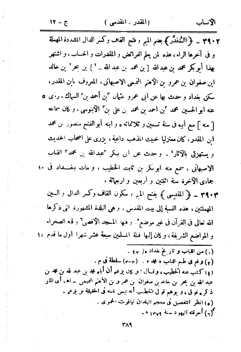 بضم الميم وفتح القاف وكسر الدال المشددة المهملة وفي آخرها الراء، هذه لمن يعلم الفرائض والمقدرات والحساب، واشتهر بهذا أبو بكر محمد بن عبد الله [بن محمد بن عبد الله-[1]] بن بحر [2] بن خالد ابن صفوان بن عمرو بن الأهتم التميمي الأصبهاني، المعروف بابن المقدر، سكن بغداد وحدث بها عن ابى عمرو عثمان [3] بن أحمد بن [3] السماك، روى عنه أبو الحسين محمد [3] بن أحمد بن محمد بن على بن [3] الآبنوسي، وكان سماعه [منه] مع أبيه في سنة تسعين وثلاثمائة وابنه أبو الفتح منصور بن محمد ابن المقدر، كان معتزليا خبيث المذهب داعية، يزرى على أصحاب الحديث ويستهزئ بالآثار [4] ، وحدث عن أبى بكر [3] عبد الله بن محمد [3] القباب الأصبهاني، سمع منه أبو بكر بن ثابت الخطيب، ومات ببغداد في جمادى الآخرة سنة اثنتين وأربعين وأربعمائة.