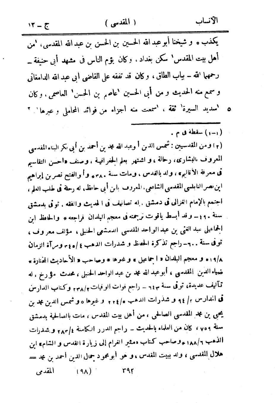 [2] ومن المقدسيين: شمس الدين أبو عبد الله محمد بن أحمد بن أبى بكر البناء المقدسي المعروف بالبشارى، رحالة، واشتهر بعلم الجغرافية، وصنف «أحسن التقاسيم في معرفة الأقاليم» ، ولد بالقدس، ومات سنة 380 وأبو الفتح نصر بن إبراهيم ابن نصر النابلسي المقدسي الشافعيّ، المعروف بابن أبى حافظ، له رحلة في طلب العلم، اجتمع بالإمام الغزالي في دمشق، له تصانيف في الحديث والفقه، توفى بدمشق سنة 490- وقد أبسط ياقوت ترجمته في معجم البلدان فراجعه والحافظ ابن الجماعيلى عبد الغنى بن عبد الواحد المقدسي الدمشقيّ الحنبلي، مؤلف معروف، توفى سنة 600- راجع تذكرة الحفاظ وشذرات الذهب 4/ 345 ومرآة الزمان 8/ 519 ومعجم البلدان «اجماعيل» وغيرها وصاحب «الأحاديث المختارة» ضياء الدين المقدسي، أبو عبد الله محمد بن عبد الواحد الحنبلي، محدث مؤرخ، له تآليف عديدة، توفى سنة 643- راجع فوات الوفيات 2/ 238 وكتاب الدارس في المدارس 2/ 94 وشذرات الذهب 5/ 224 وغيرها وشمس الدين محمد بن يحيى بن محمد المقدسي الصالحي، من أهل بيت المقدس، مات بالصالحية بدمشق سنة 759، كان من العلماء بالحديث- راجع الدرر الكامنة 4/ 283 وشذرات الذهب 6/ 188 وصاحب كتاب «مثير الغرام إلى زيارة القدس والشام» ابن هلال المقدسي، ولد ببيت المقدس، وهو أبو محمود جمال الدين أحمد بن محمد