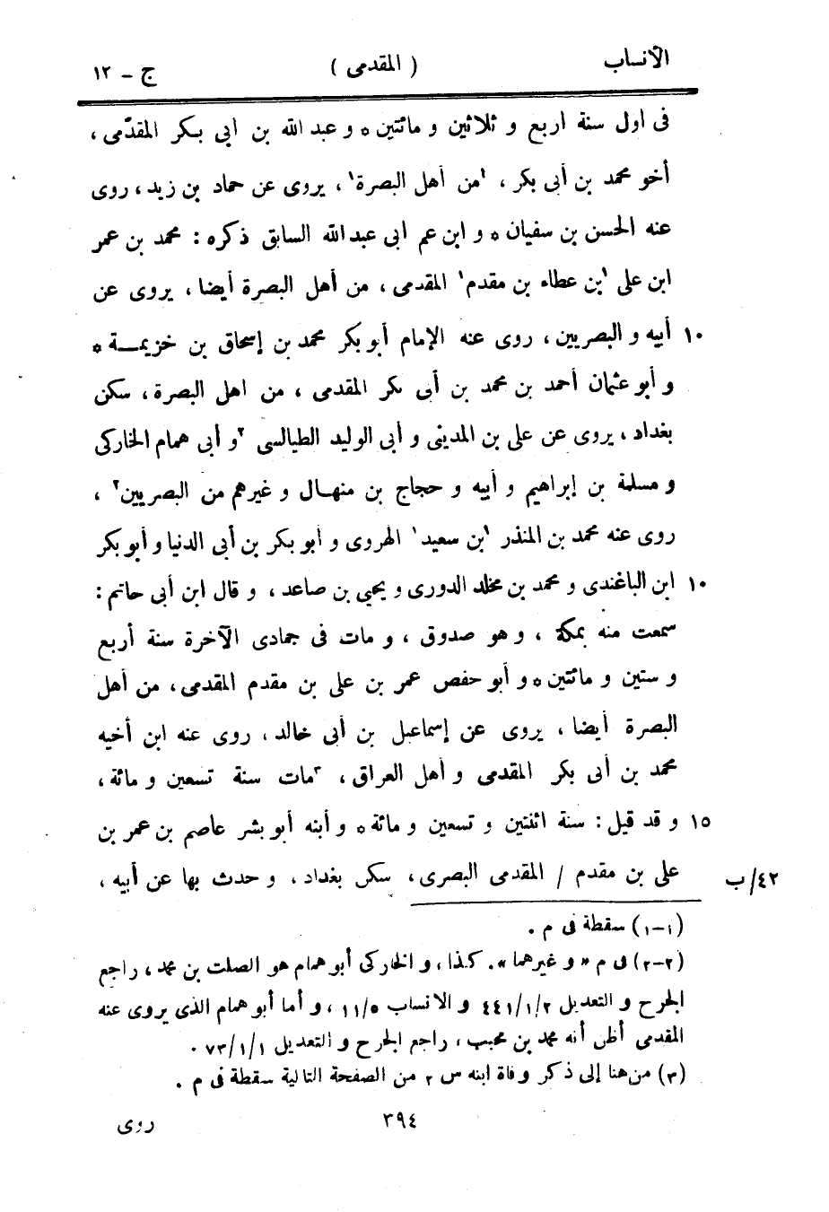 في أول سنة أربع وثلاثين ومائتين وعبد الله بن أبى بكر المقدّمي، أخو محمد بن أبى بكر، [1] من أهل البصرة [1] ، يروى عن حماد بن زيد، روى عنه الحسن بن سفيان وابن عم أبى عبد الله السابق ذكره: محمد بن عمر ابن على [1] بن عطاء بن مقدم [1] المقدمي، من أهل البصرة أيضا، يروى عن أبيه والبصريين، روى عنه الإمام أبو بكر محمد بن إسحاق بن خزيمة وأبو عثمان أحمد بن محمد بن أبى بكر المقدمي، من أهل البصرة، سكن بغداد، يروى عن على بن المديني وأبى الوليد الطيالسي [2] وأبى همام الخاركى ومسلمة بن إبراهيم وأبيه وحجاج بن منهال وغيرهم من البصريين [2] ، روى عنه محمد بن المنذر [1] بن سعيد [1] الهروي وأبو بكر بن أبى الدنيا وأبو بكر ابن الباغندي ومحمد بن مخلد الدوري ويحيى بن صاعد، وقال ابن أبى حاتم:
