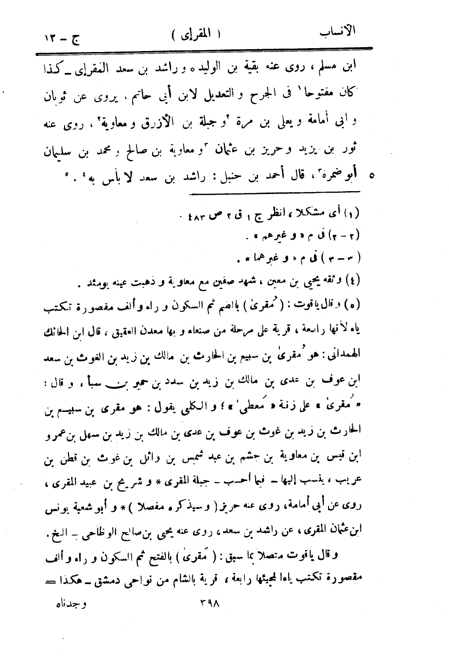 «مقرى» على زنة «معطي» ، والكلبي يقول: هو مقرى بن سبيع بن الحارث بن زيد بن غوث بن عوف بن عدي بن مالك بن زيد بن سهل بن عمرو ابن قيس بن معاوية بن جشم بن عبد شمس بن وائل بن غوث بن قطن بن عريب، ينسب إليها- فيما أحسب- جبلة المقري وشريح بن عبيد المقري، روى عن أبى أمامة، روى عنه حريز (وسيذكره مفصلا) وأبو شعبة يونس ابن عثمان المقري، عن راشد بن سعد، روى عنه يحيى بن صالح الوضاحي- إلخ.