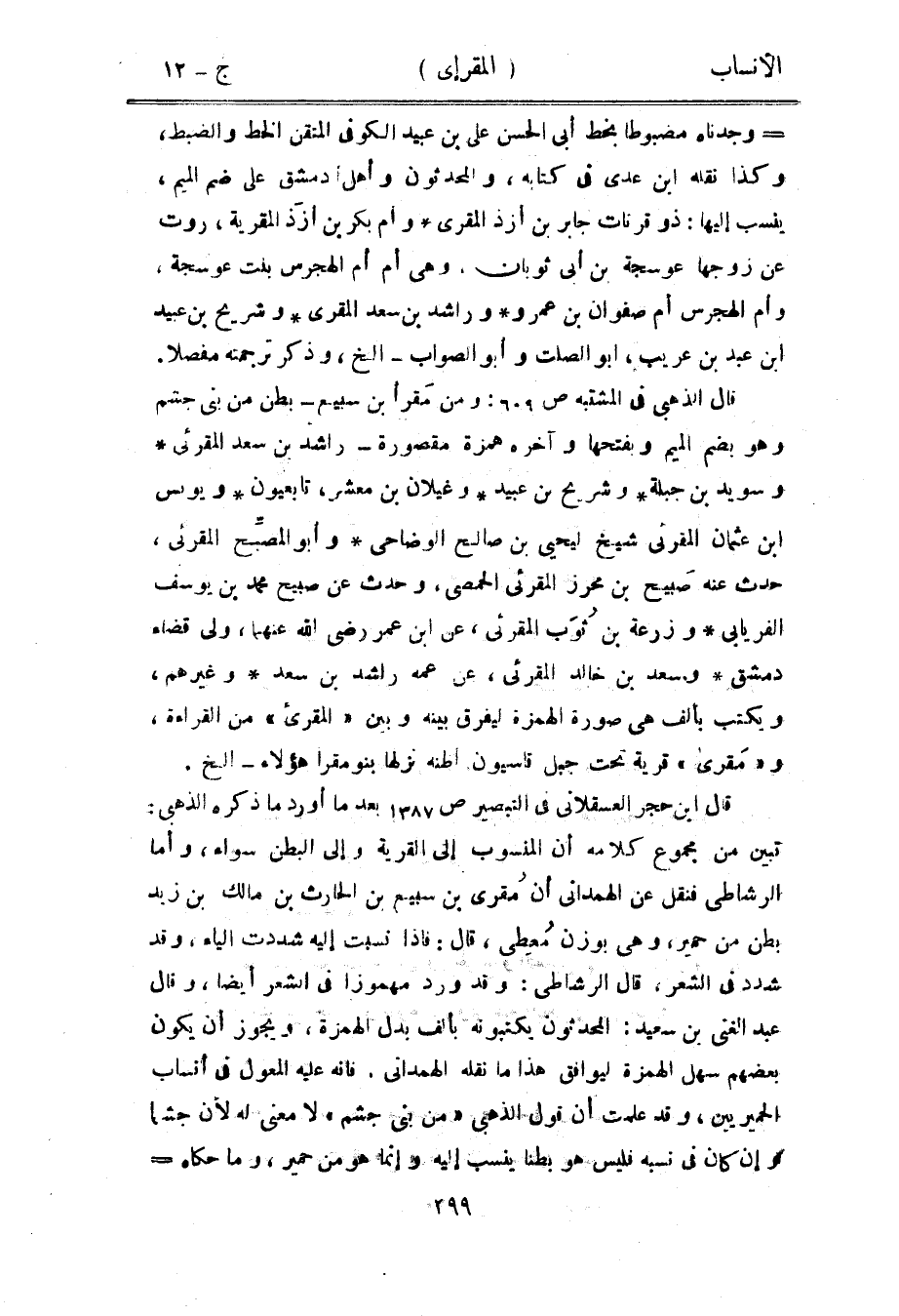 تبين من مجموع كلامه أن المنسوب إلى القرية وإلى البطن سواء، وأما الرشاطى فنقل عن الهمدانيّ أن مقرى بن سبيع بن الحارث بن مالك بن زيد بطن من حمير، وهي بوزن معطي، قال: فإذا نسبت إليه شددت الياء، وقد شدد في الشعر، قال الرشاطى: وقد ورد مهموزا في الشعر أيضا، وقال عبد الغنى بن سعيد: المحدثون يكتبونه بألف بدل الهمزة، ويجوز أن يكون بعضهم سهل الهمزة ليوافق هذا ما نقله الهمدانيّ، فإنه عليه المعول في أنساب الحميريين، وقد علمت أن قول الذهبي «من بنى جشم» لا معنى له لأن جشما وإن كان في نسبه فليس هو بطنا ينسب إليه وإنما هو من حمير، وما حكاه