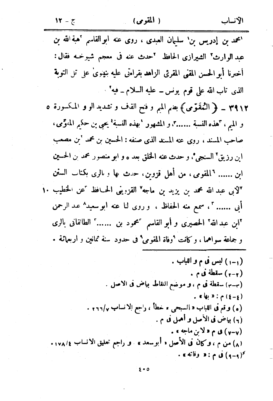 بضم الميم وفتح القاف وتشديد الواو المكسورة والميم، [3] هذه النسبة ... [3] ، والمشهور [4] بهذه النسبة [4] يحيى بن حكيم المقوّمي، صاحب المسند، روى عنه المسند الّذي صنفه: الحسين بن محمد [2] بن مصعب ابن رزيق [2] السنجى [5] ، وحدث عنه الخلق بعد وأبو منصور محمد بن الحسين ابن ... [6] المقومي، من أهل قزوين، حدث بها وبالري بكتاب السنن [7] لأبى عبد الله محمد بن يزيد بن ماجة [7] القزويني الحافظ [3] عن الخطيب أبى ... [3] ، سمع منه الحفاظ، وروى لنا عنه أبو سعيد [8] عبد الرحمن [2] ابن عبد الله [2] الحصيري وأبو القاسم [3] محمود بن ... [3] الطالقانيّ بالري وجماعة سواهما، وكانت [9] وفاة المقومي [9] في حدود سنة ثمانين وأربعمائة.
