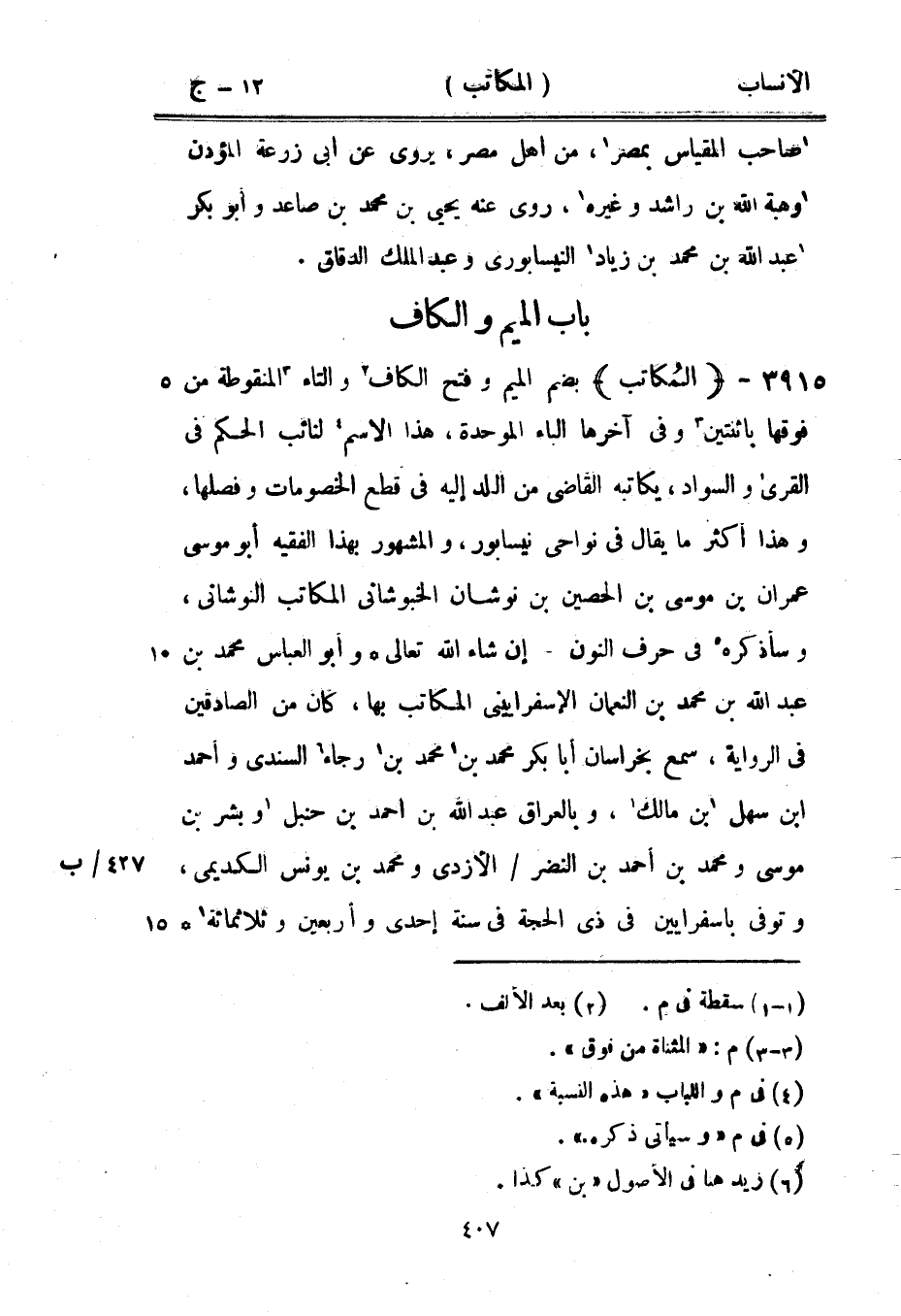 بضم الميم وفتح الكاف [2] والتاء [3] المنقوطة من فوقها باثنتين [3] وفي آخرها الباء الموحدة، هذا الاسم [4] لنائب الحكم في القرى [1] والسواد، يكاتبه القاضي من البلد إليه في قطع الخصومات وفصلها، وهذا أكثر ما يقال في نواحي نيسابور، والمشهور بهذا الفقيه أبو موسى عمران بن موسى بن الحصين بن نوشان الخبوشانيّ المكاتب النوشانى، وسأذكره [5] في حرف النون- إن شاء الله تعالى وأبو العباس محمد بن عبد الله بن محمد بن النعمان الأسفرايينى المكاتب بها، كان من الصادقين في الرواية، سمع بخراسان أبا بكر بن [1] محمد بن [1] محمد بن [1] رجاء [6] السندي وأحمد ابن سهل [1] بن مالك [1] ، وبالعراق عبد الله بن أحمد بن حنبل [1] وبشر بن موسى ومحمد بن أحمد بن النضر/ الأزدي ومحمد بن يونس الكديمي، وتوفى بأسفرايين في ذي الحجة في سنة إحدى وأربعين وثلاثمائة [1]