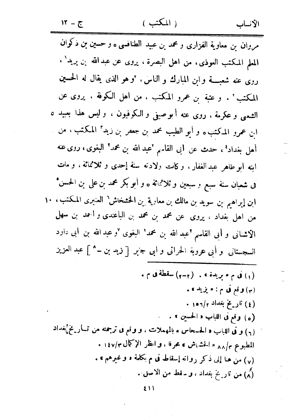 مروان بن معاوية الفزاري ومحمد بن عبيد الطنافسي وحسين بن ذكوان المعلم المكتب العوذى، من أهل البصرة، يروى عن عبد الله بن بريد [1] ، روى عنه شعبة وابن المبارك والناس، [2] وهو الّذي يقال له الحسين المكتب [2] ، وعتبة بن عمرو المكتب، من أهل الكوفة، يروى عن الشعبي وعكرمة، روى عنه أبو صيفي والكوفيون، وليس هذا بعبيد ابن عمرو المكتب وأبو الطيب محمد بن جعفر بن زيد [3] المكتب، من أهل بغداد [4] ، حدث عن أبى القاسم [2] عبد الله بن محمد [2] البغوي، روى عنه ابنه ابو طاهر عبد الغفار، وكانت ولادته سنة إحدى وثلاثمائة، ومات في شعبان سنة سبع وسبعين وثلاثمائة وأبو بكر محمد بن على بن الحسن [5] ابن إبراهيم بن سويد بن مالك بن معاوية بن الخشخاش [6] العنبري المكتب، من أهل بغداد، يروى عن محمد بن محمد بن الباغندي وأحمد بن سهل الأشناني وأبى القاسم [2] عبد الله بن محمد [2] البغوي [7] وعبد الله بن أبى داود السجستاني وأبى عروبة الحراني وأبى جابر [زيد بن-[8]] عبد العزيز