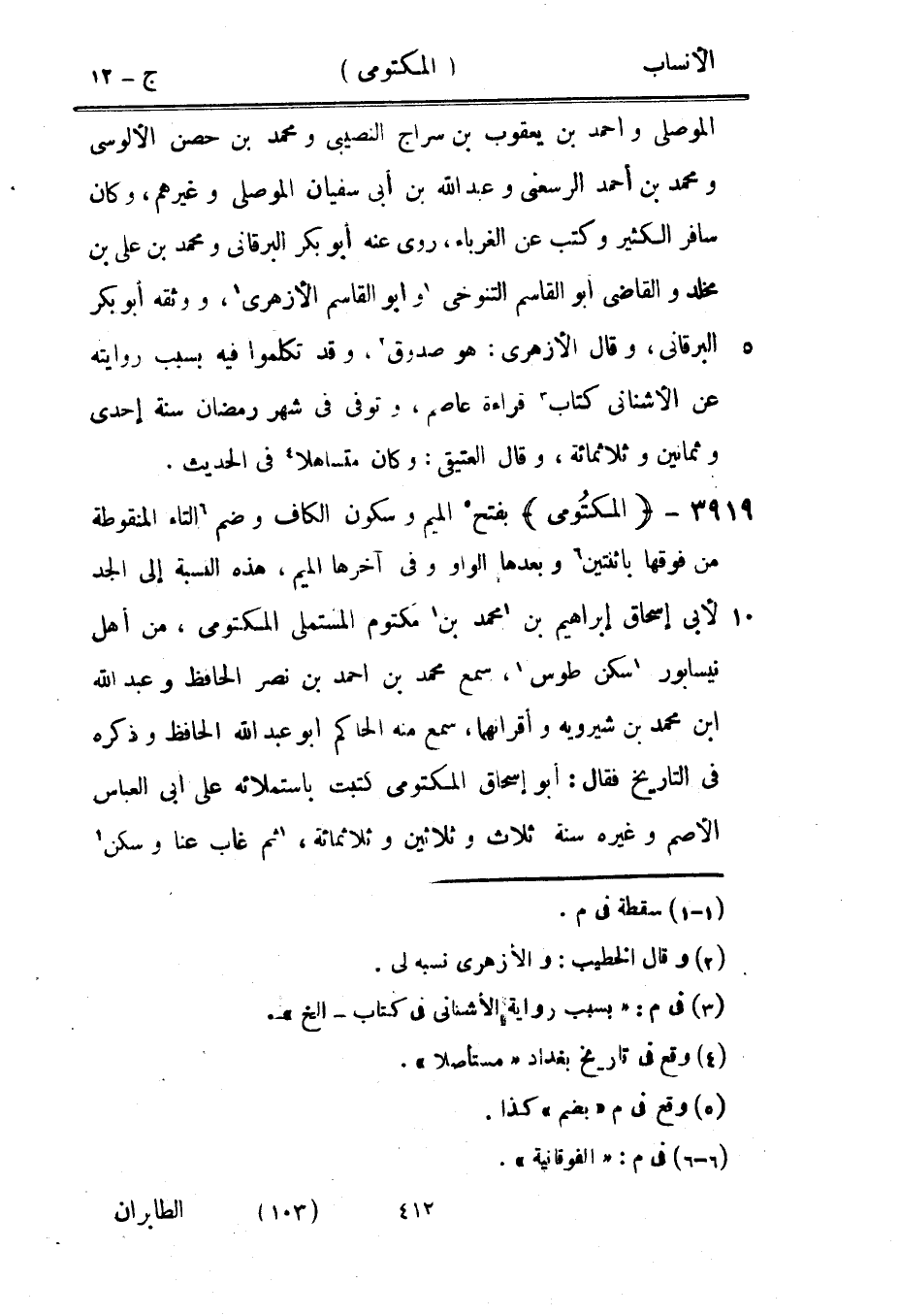 بفتح [5] الميم وسكون الكاف وضم [6] التاء المنقوطة من فوقها باثنتين [6] وبعدها الواو وفي آخرها الميم، هذه النسبة إلى الجد لأبى إسحاق إبراهيم بن [1] محمد بن [1] مكتوم المستملي المكتومى، من أهل نيسابور [1] سكن طوس [1] ، سمع محمد بن أحمد بن نصر الحافظ وعبد الله ابن محمد بن شيرويه وأقرانهما، سمع منه الحاكم أبو عبد الله الحافظ وذكره في التاريخ فقال: أبو إسحاق المكتومى كتبت باستملائه على أبى العباس الأصم وغيره سنة ثلاث وثلاثين وثلاثمائة، [1] ثم غاب عنا وسكن [1]